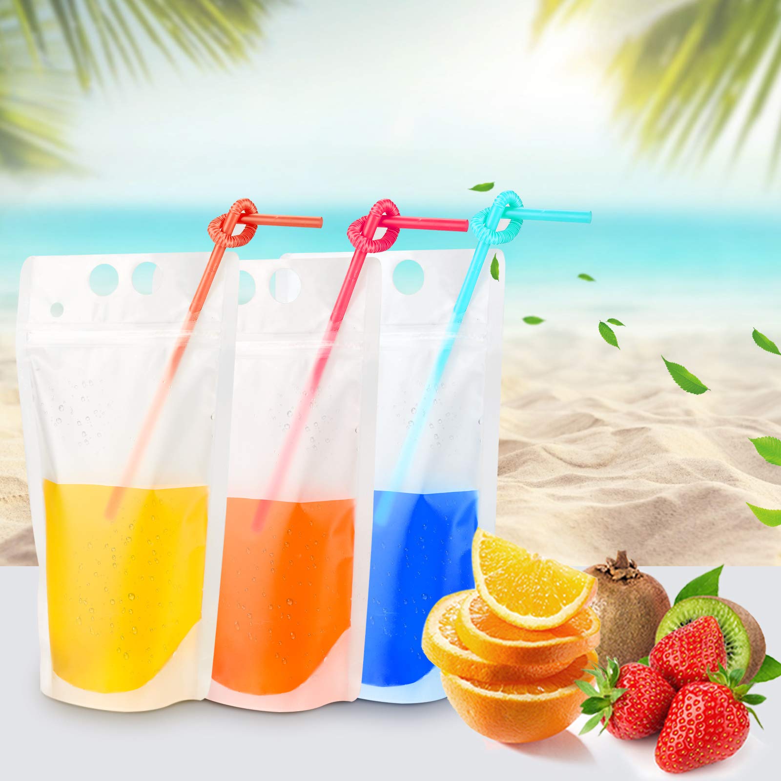 100PCs Drink Pouches with 100PCS Individual Wrapped Straws Yamgqus Freezable Juice Pouches DIY Reclosable Zipper Drink Bags for Adults and Kids Silicone Funnel Included 17oz 100 Pack