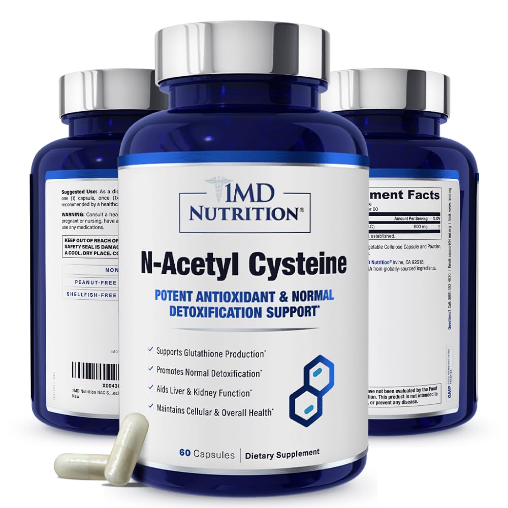 1MD Nutrition NAC Supplement N-Acetyl Cysteine - NAC 600 mg - Antioxidant Supplement Supports Detox and Glutathione Production - N Acetylcysteine Respiratory Supplement for Lung Health - 60 Capsules