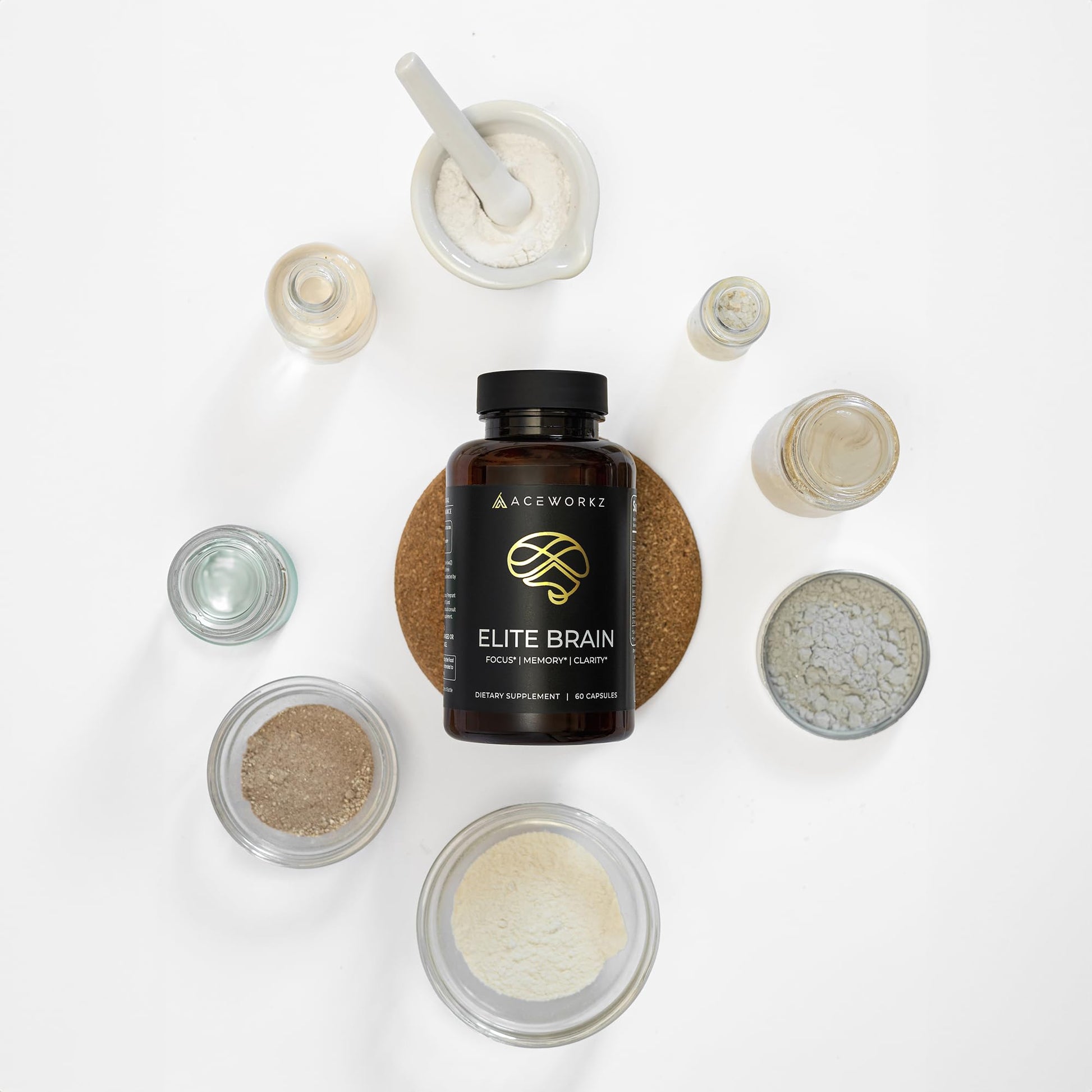 ACEWORKZ Elite Brain - Nootropic Brain Supplement for Focus, Memory, & Mental Clarity - ALCAR, Lions Mane, ALA, L-Theanine, Vitamin B Complex - Natural Energy, Caffeine-Free (60 Capsules)