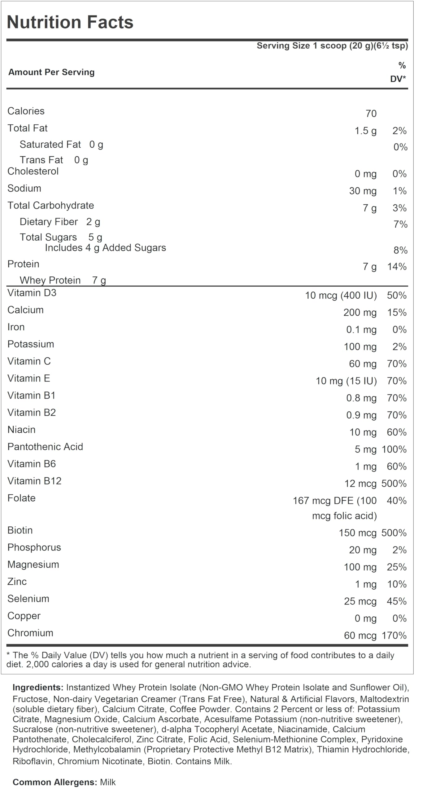 - Delicious & nutritious! World's lowest calorie meal replacement to embrace a weight-loss regimen that actually works - Whey-protein based version, great tasting coffee shake at only 70 calories. Delivers a healthy source of protein, fiber and 20 essential vitamins and minerals. Delivers 7 grams of ultra-high quality whey protein. Provides between 50% and 500% of the RDI of 10 essential vitamins, plus 9 vital minerals, including 200 milligrams of Calcium.