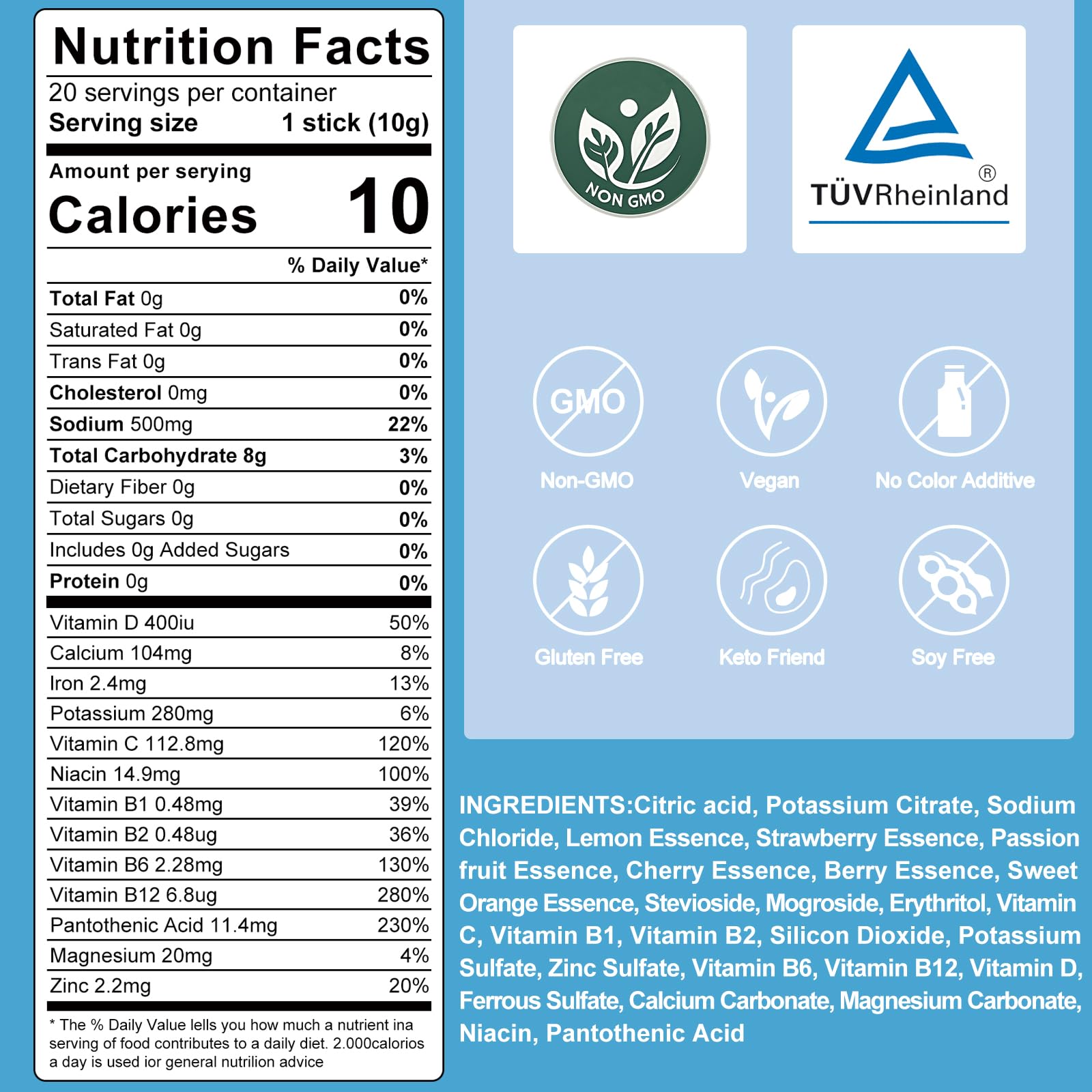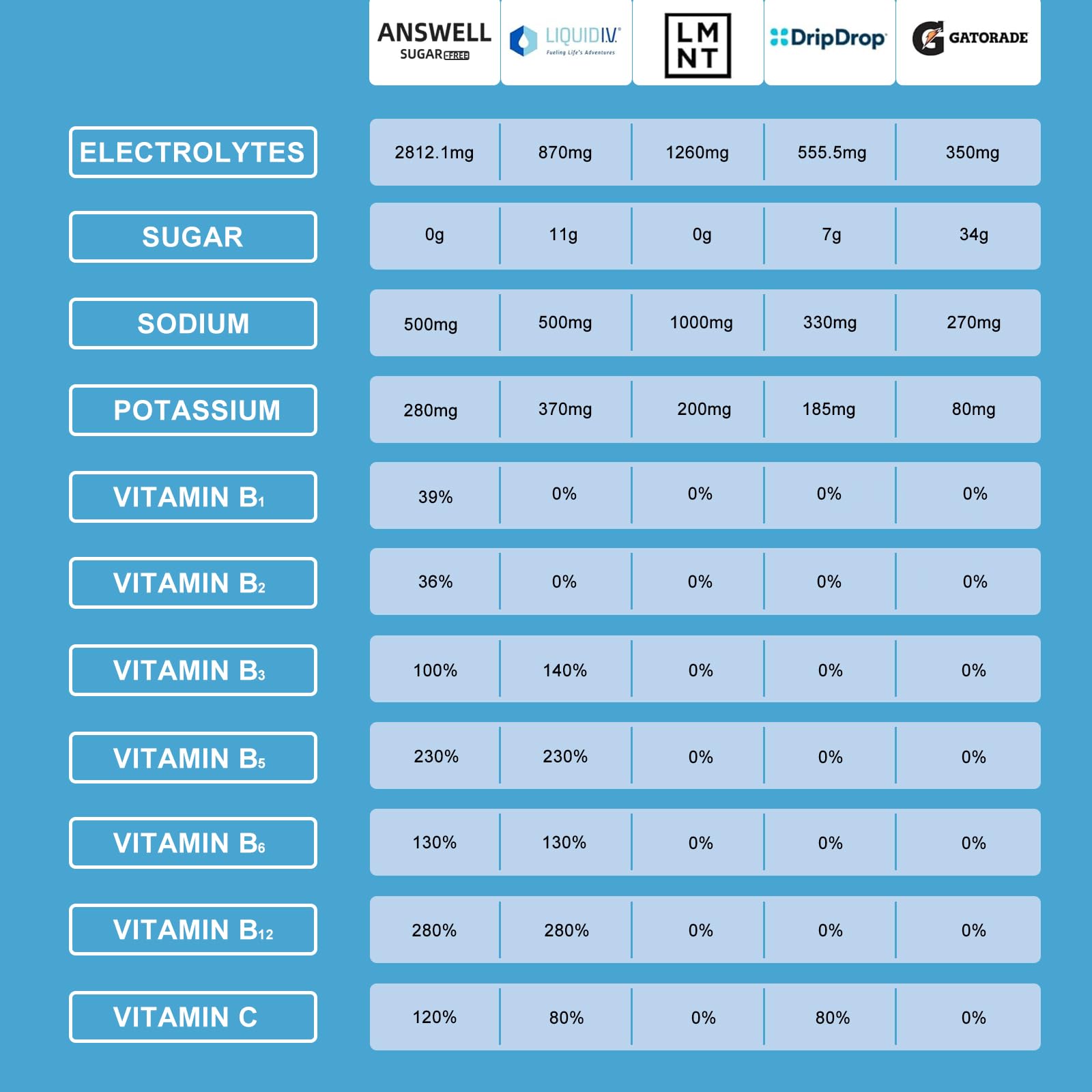 - SUGAR FREE AND NO COLOR ADDITIVES: As is well known, sodium plays a crucial role in maintaining fluid balance. However, most electrolyte mixtures on the market are either too salty or too sweet, and they contain a large amount of artificial color additives. ANSWELL's Hydrate Answer is a sugar-free electrolyte powder packet without artificial color additives. The sodium content in it is within the daily value recommended by the American Heart Association, making it a more reassuring choice compared to any other electrolyte product.