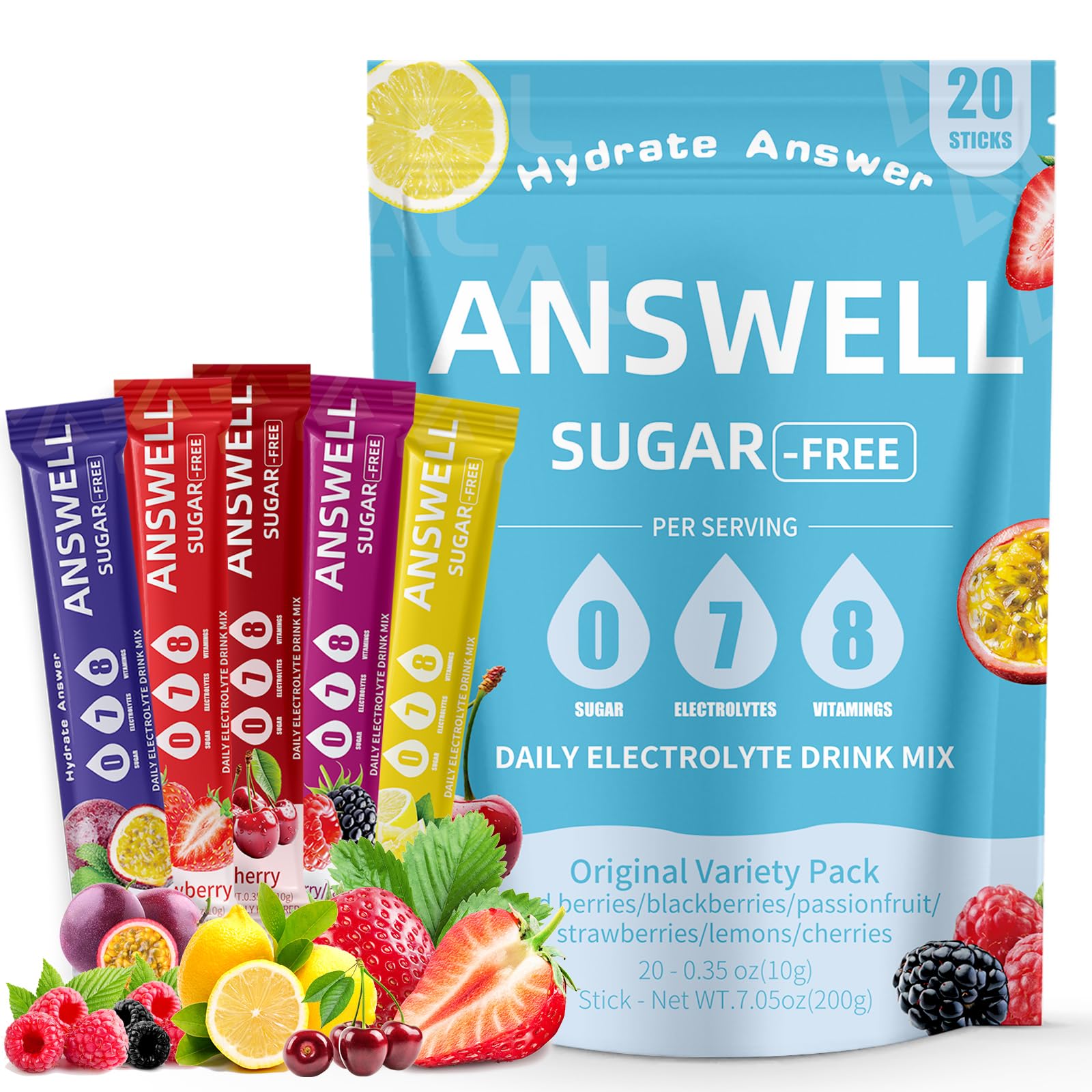 ANSWELL Electrolytes Powder Packets Sugar Free - Liquid Daily IV Drink Mix for Rapid Hydration & Party Recovery | 7 Electrolytes & 8 Vitamins | Non-GMO | No Color Additive | Vegan | Variety 20 Sticks