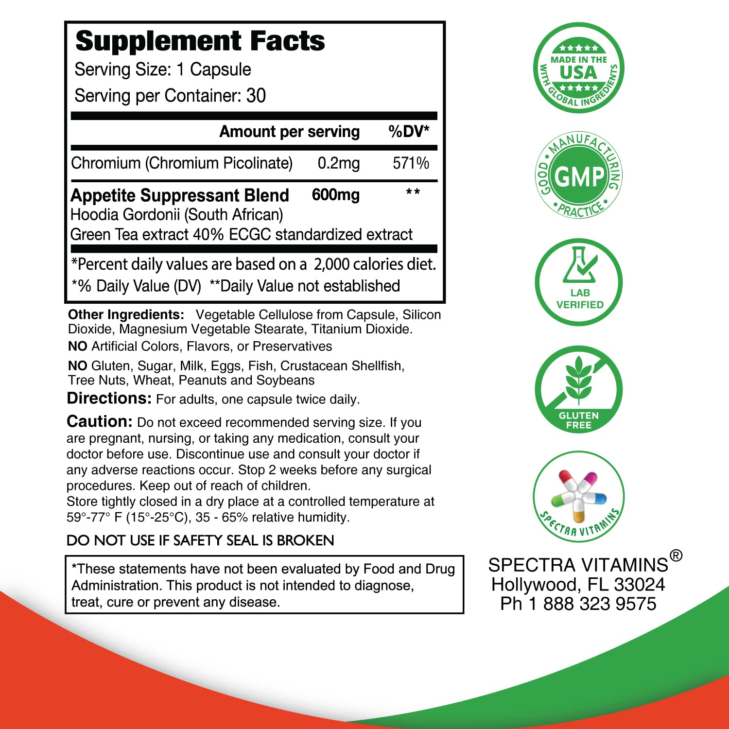 Appetite Suppressant 30 Capsules - S. African Hoodia and Green Tea Extract Control Appetite, Support Weight Loss, Increase Energy and Metabolism, Made in USA