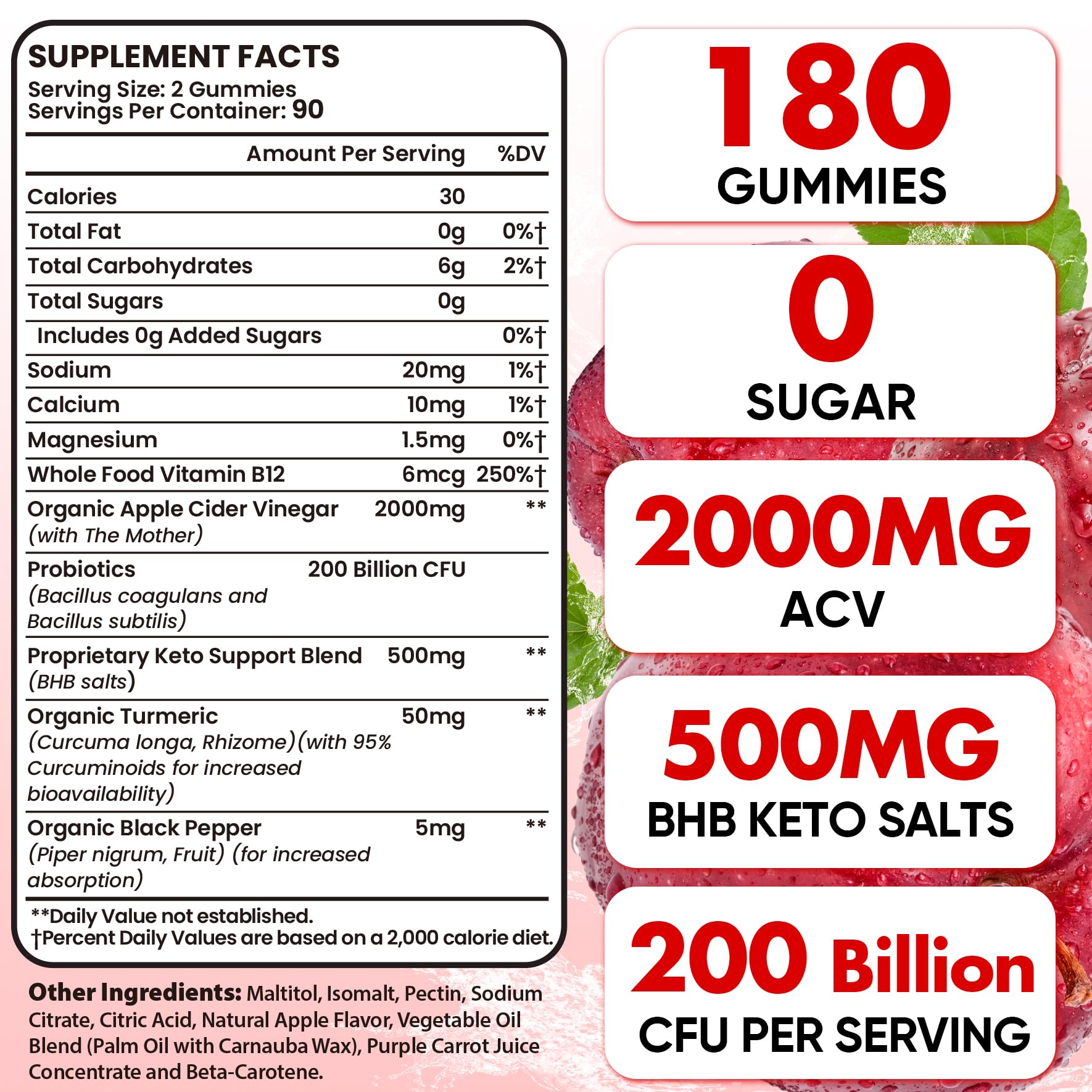 - Max Strength ACV Gummies: Our apple cider vinegar gummies each serving is packed with an impressive 2000mg of the organic apple cider vinegar (with the mother), along with 200 Billion CFU Probiotics, BHB, B12, Keto, Organic turmeric and Black Pepper. These keto acv gummies are designed to for detox, cleanse, metabolism, digestion, vitality