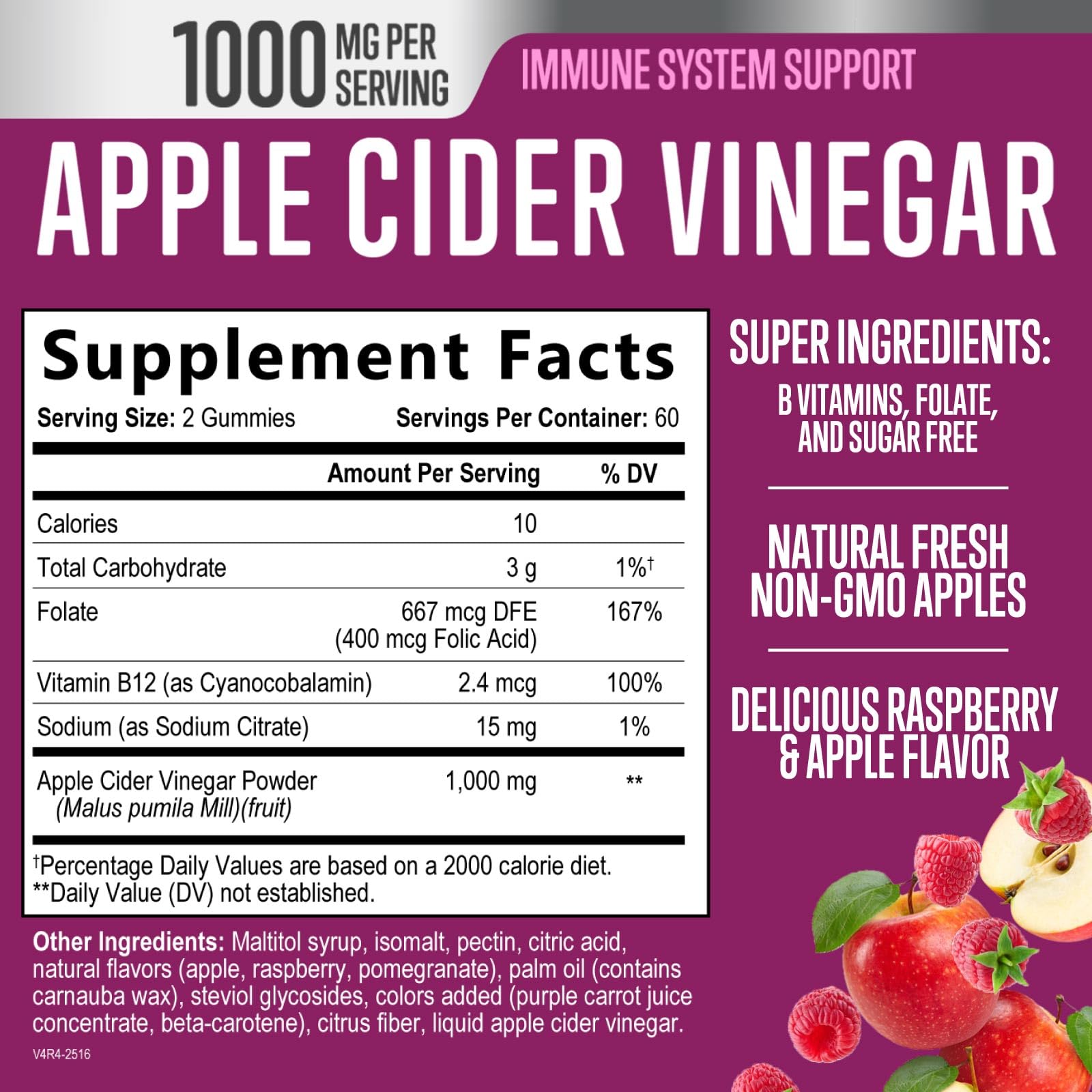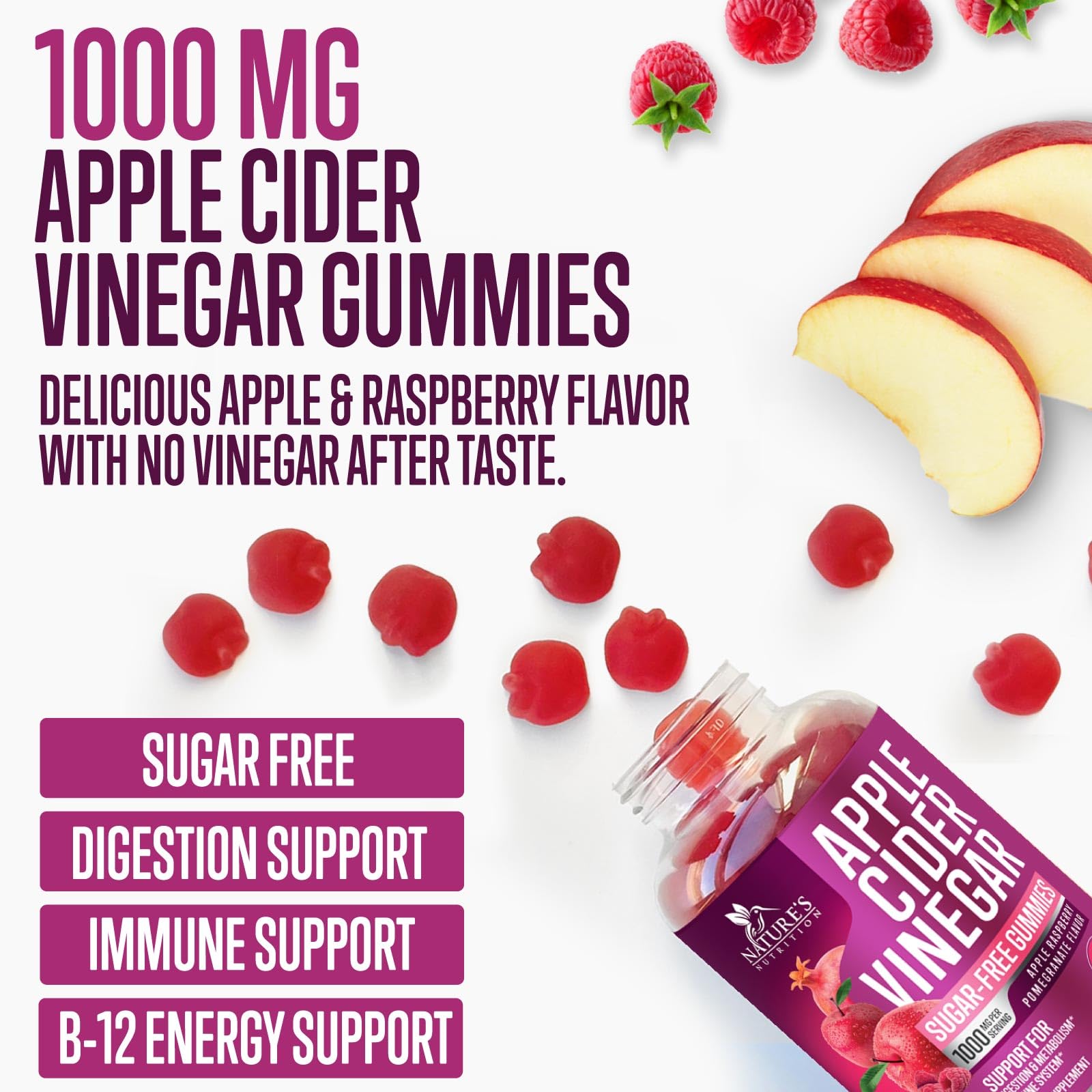 - Sugar Free Apple Cider Vinegar Gummies: Enjoy the benefits of apple cider vinegar without the harsh taste or added sugar, these ACV gummies support digestion, and immune support health in a delicious apple raspberry flavor