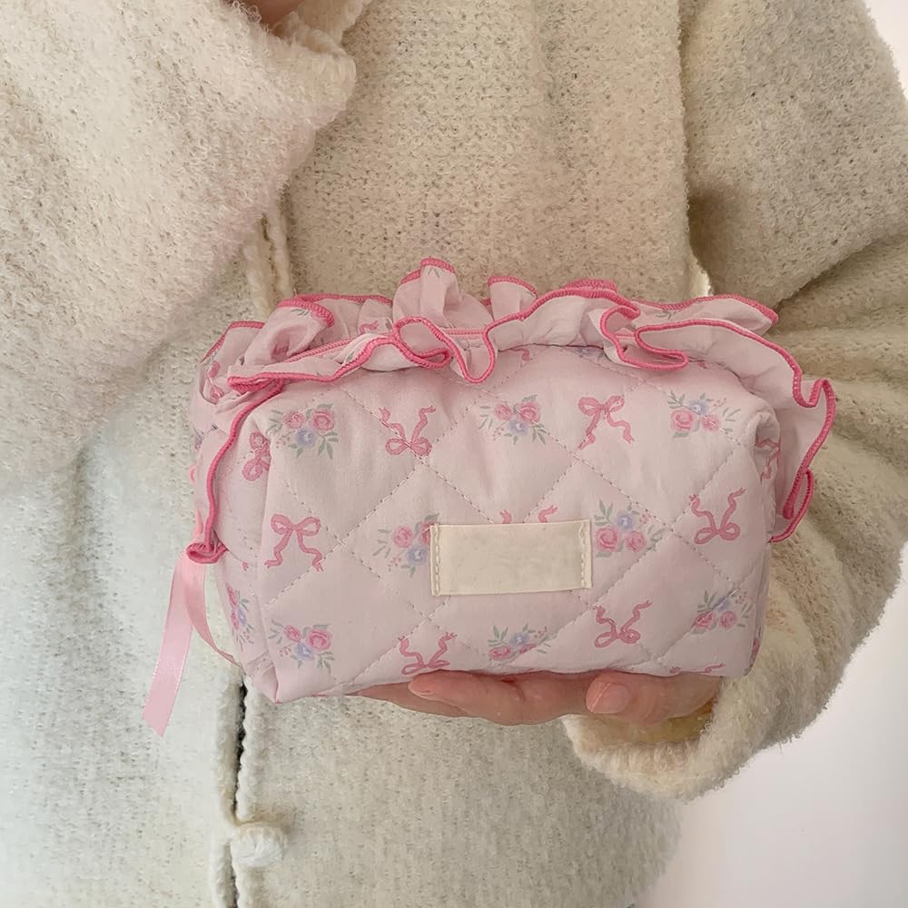 Arvintas Quilted Makeup Bag, Cute Pouch Travel Toiletry Period Bag, Pink bow Zipper Make Up Pouch for Women Girls (Style 2)