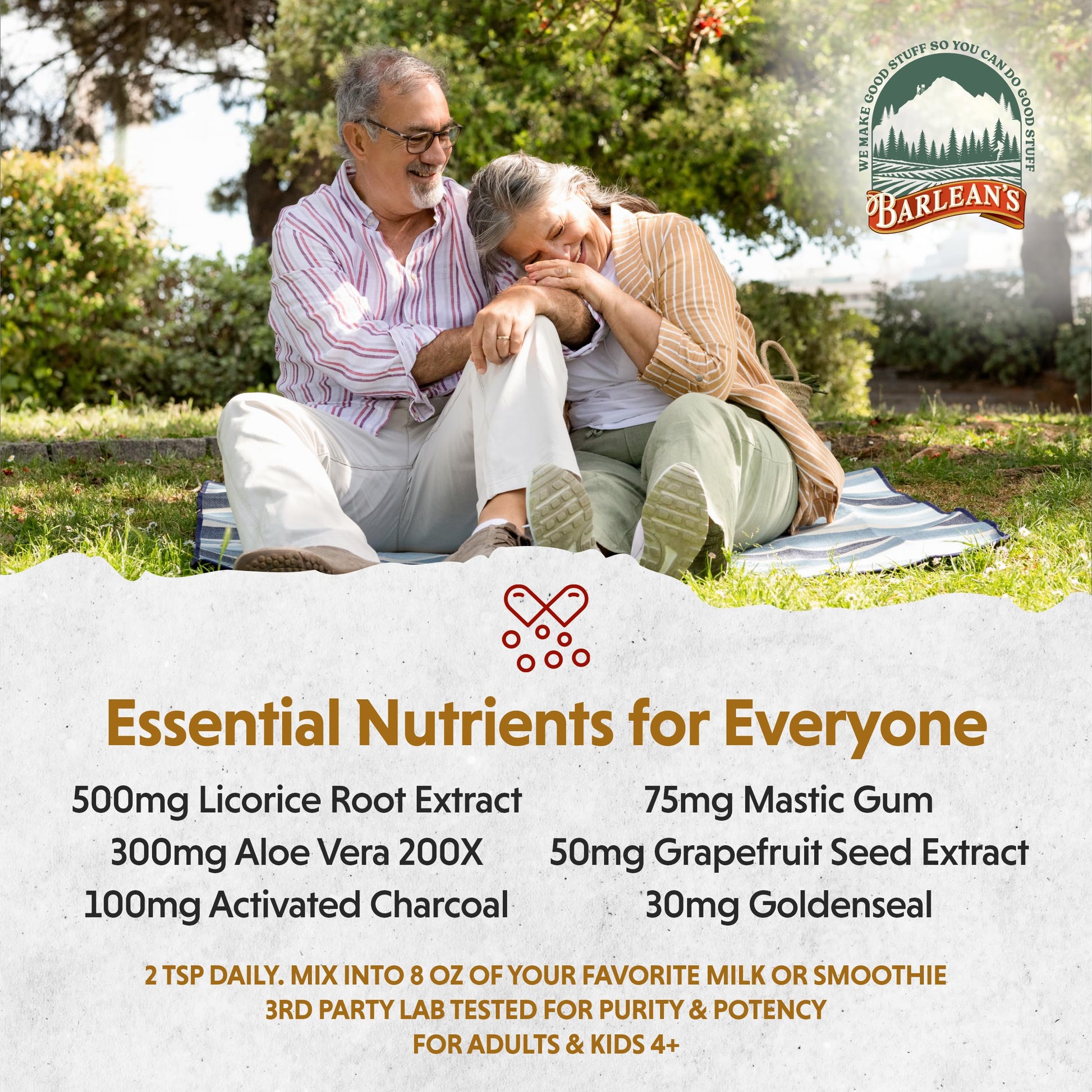 - 6 HEALING INGREDIENTS: 6 active ingredients precisely formulated for optimum gut health benefits includes Deglycyrrhizinated Licorice Root Extract, Aloe Vera 200x, Activated Charcoal, Mastic Gum, Grapefruit Seed Extract, Goldenseal. Note that the Charcoal gives the powder a very dark color