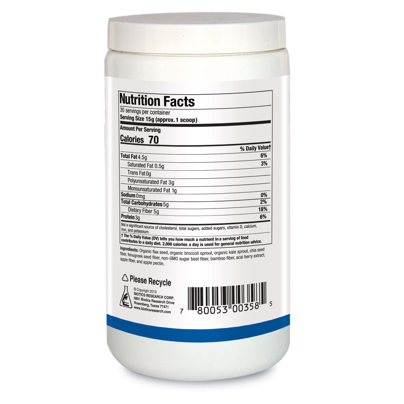 - WHOLE FOOD FIBER - Most fiber products contain only extracted fibers; BioFiber Complete provides fiber from whole food sources such as organic flax seed, organic broccoli sprout, organic kale sprout, chia, fenugreek, sugar beet, bamboo, acai berry, and apple