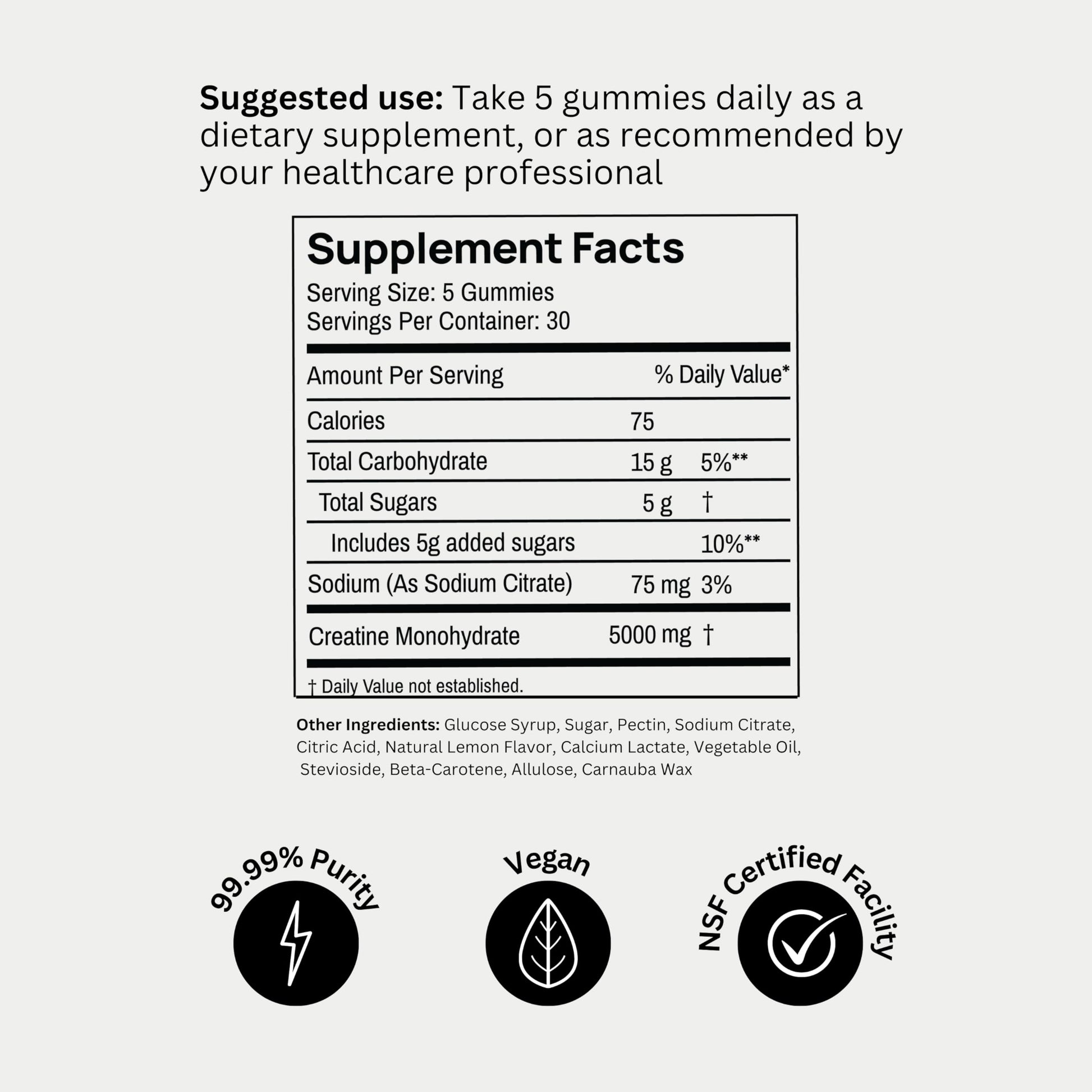- CREATINE MONOHYDRATE GUMMIES: Creatine monohydrate is a form of creatine that has long been used to help with muscle energy, muscle endurance, fatigue, and performance. These creatine gummies come in a delicious lemon drop flavor.
