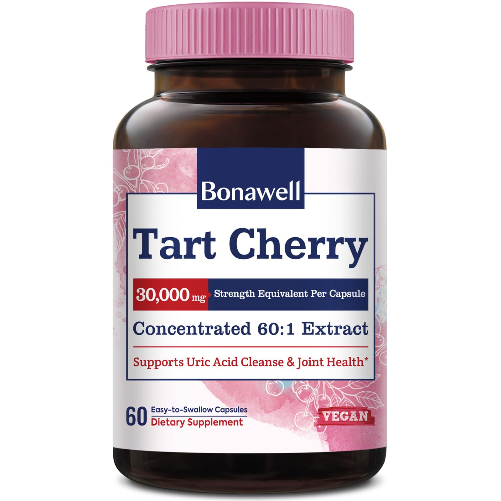 Bonawell Tart Cherry 60:1 Extract, 30000mg Strength, Made from Montmorency Tart Cherries, Powerful Uric Acid Cleanse for Joint Comfort, 2 Month Supply, 60 Capsules