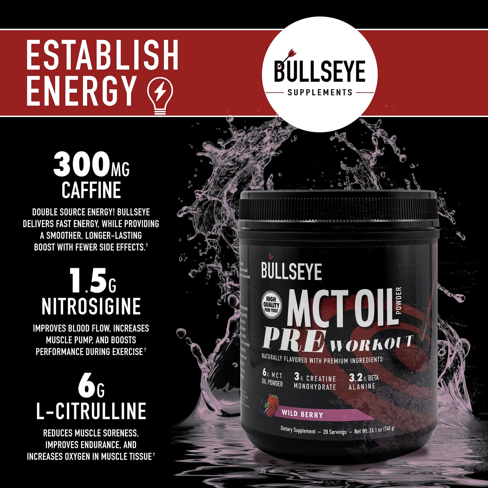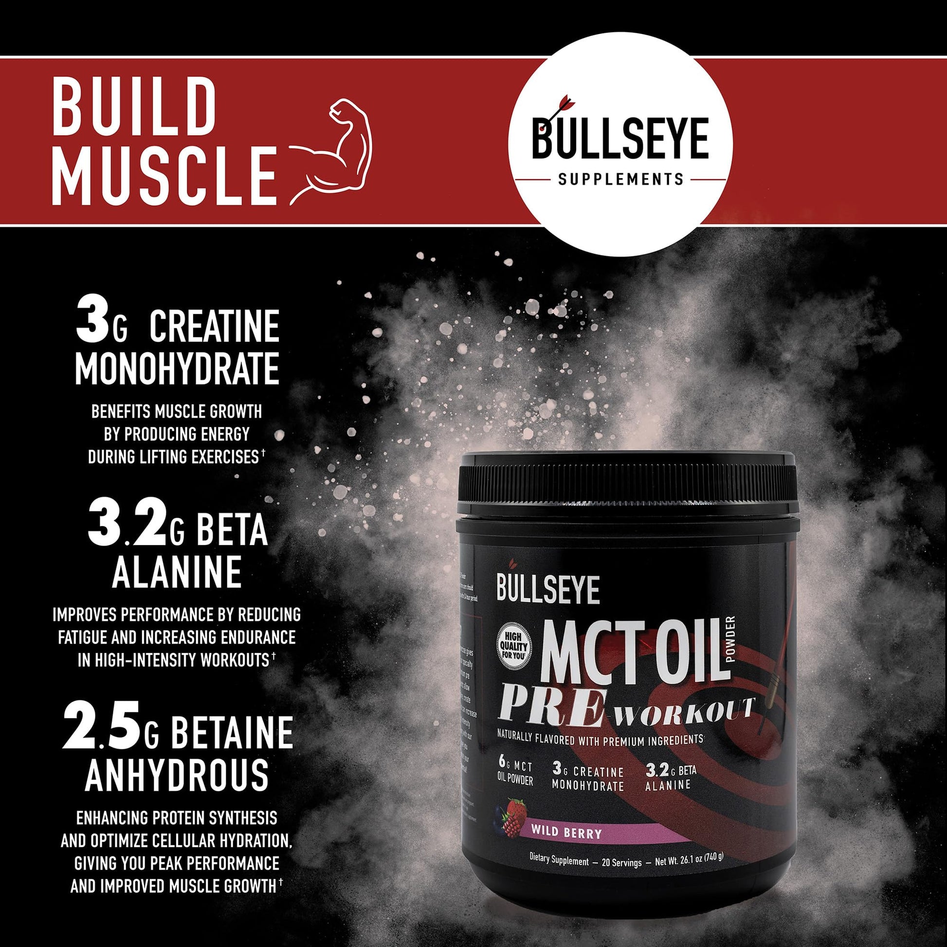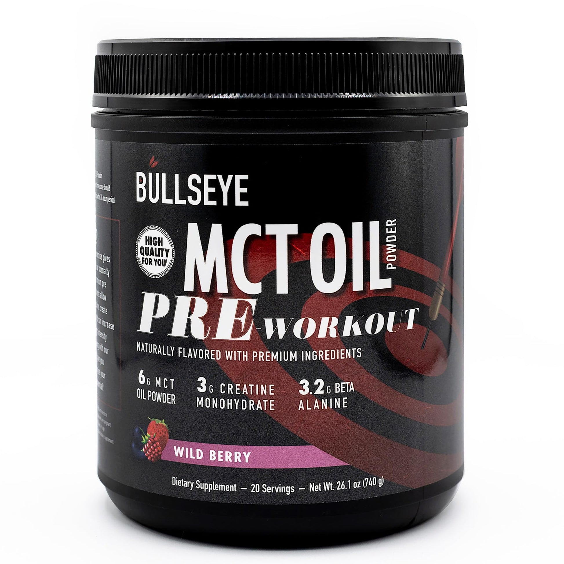 Bullseye MCT Oil Pre Workout Supplement - Creatine Monohydrate, Medium Chain Triglycerides, Beta Alanine, Caffeine, L-Citrulline, Muscle Gainer, Focus, Endurance, Energy -20 Servings - Wild Berry
