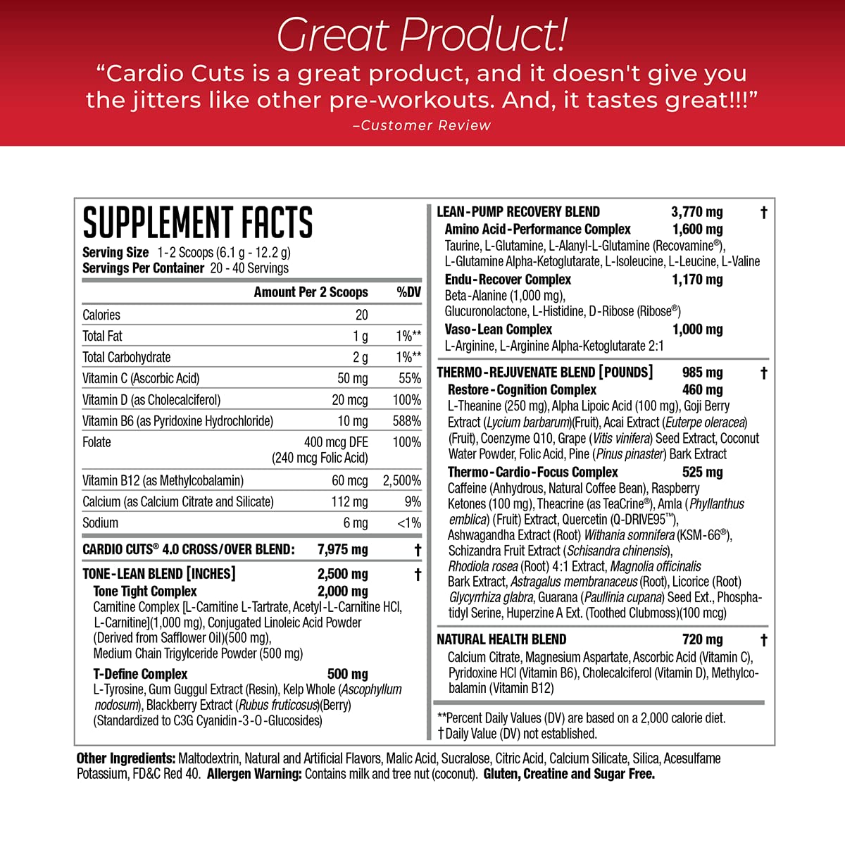 - Quicker Recovery: After an aggressive workout, Cardio Cuts has you covered. Packed with Glutamine, BCAAs, and a thorough Rejuvenation Complex, Cardio Cuts supports quicker recovery and repair. Cardio Cuts tastes great and mixes well.