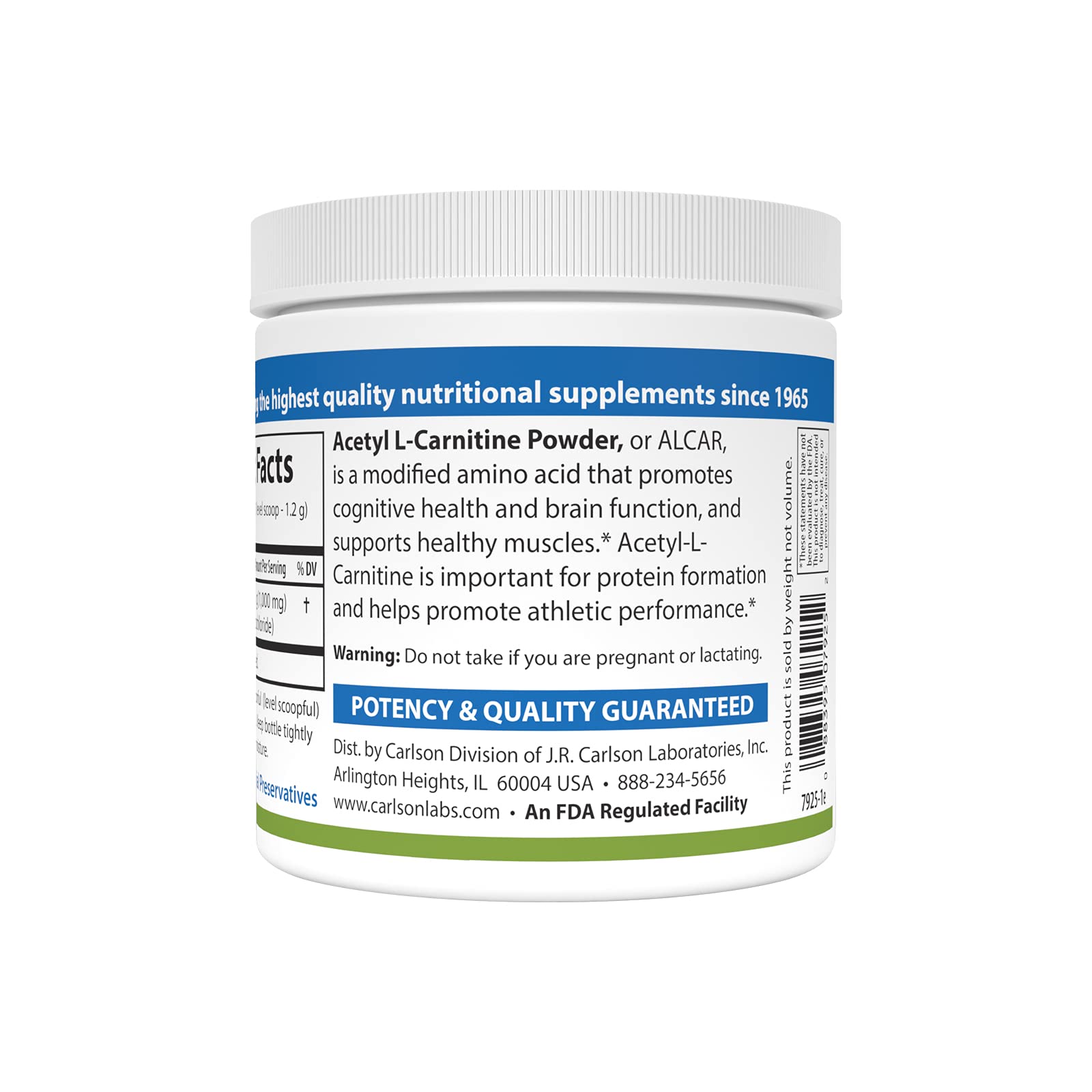 Carlson - Acetyl L-Carnitine Powder, Free-Form Amino Acid, Cognitive Health, Brain Function & Muscle Support, 3.53 oz (100 g)