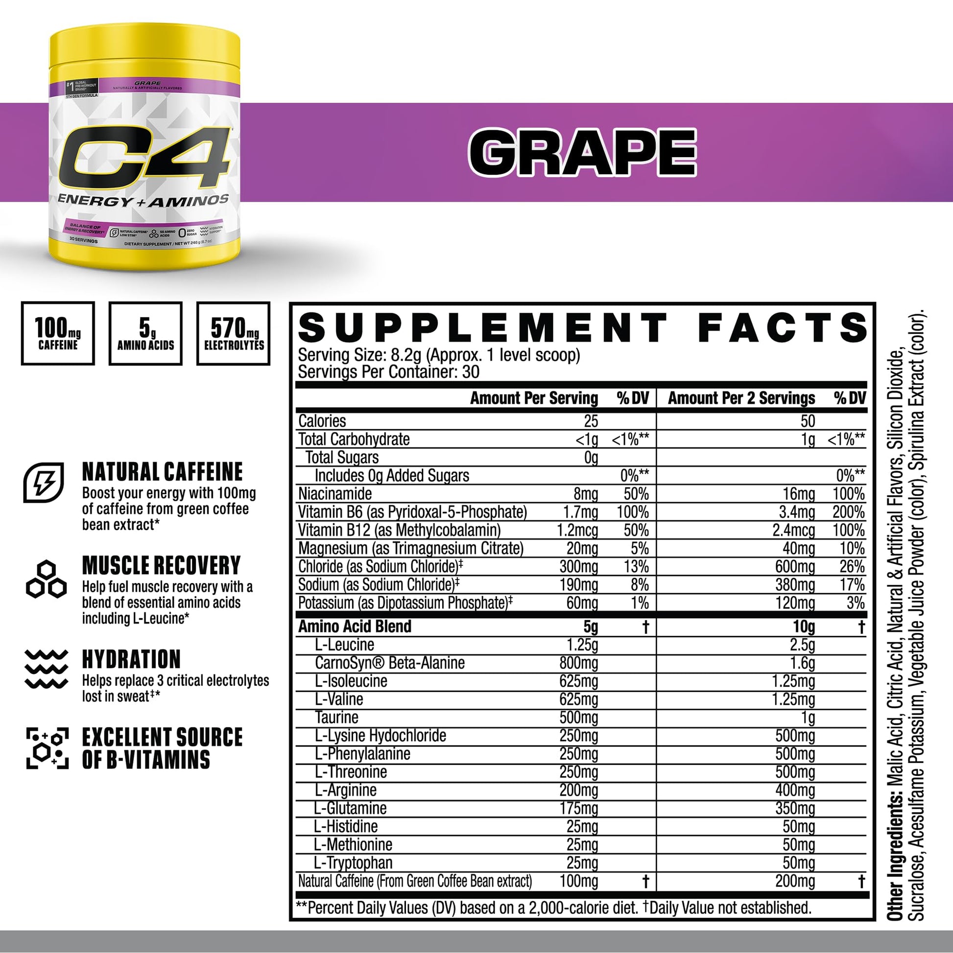 Cellucor C4 Energy + Aminos Powder | 5g BCAAs & EAAs for Muscle Recovery, 3 Electrolytes for Hydration, 100mg Natural Caffeine | Pre Workout | Zero Sugar, 30 Servings, Grape