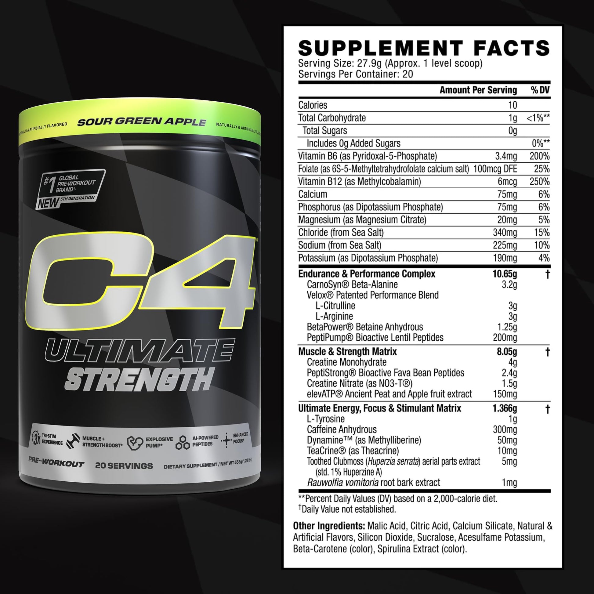 Cellucor C4 Ultimate Strength Pre Workout Powder - Tri-Stim Experience 300mg Caffeine+TeaCrine+Dynamine - Creatine & Beta-Alanine - Energy Supplement for Men & Women - Sour Green Apple, 20 Servings