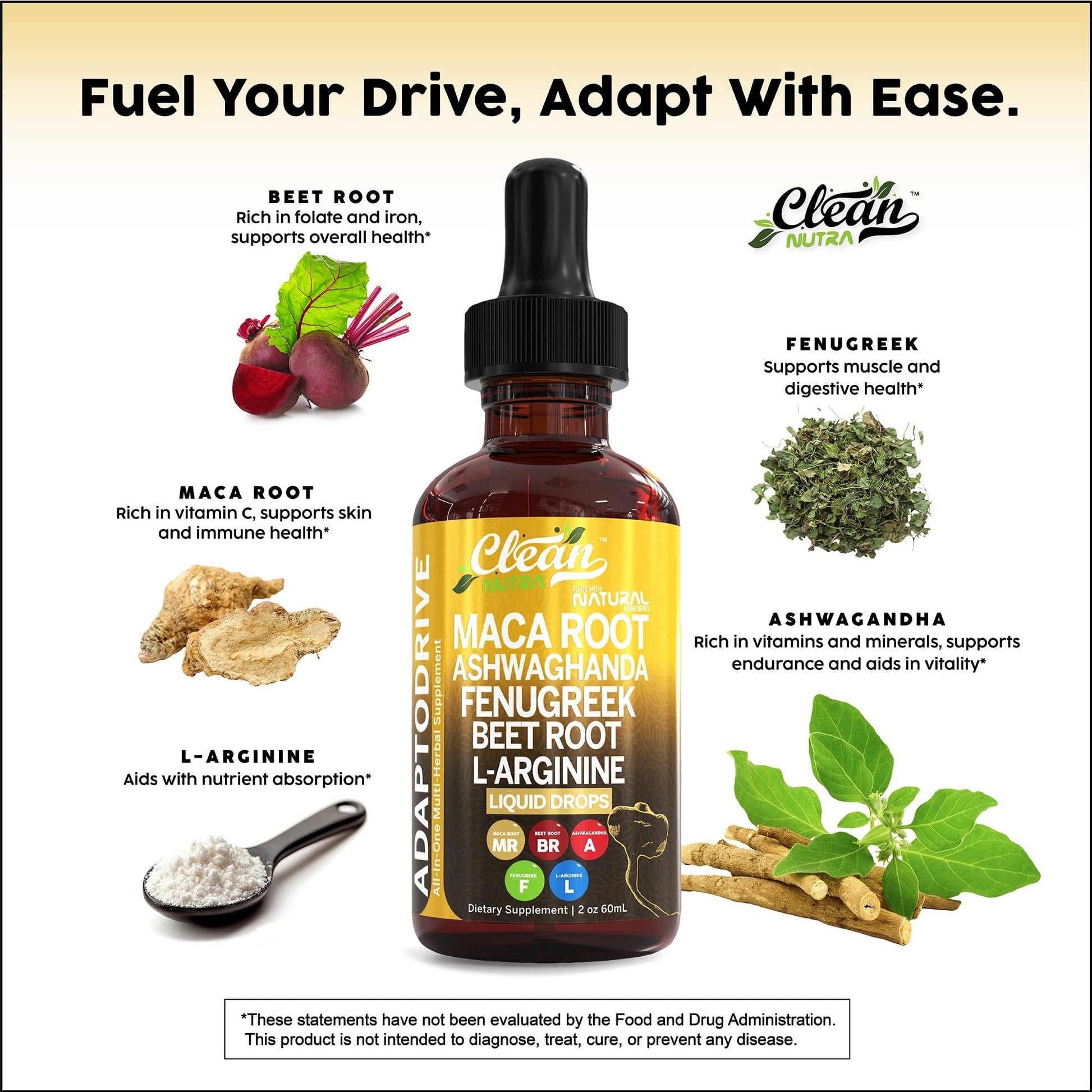 - Maca Root Drops For Women And Men: Formulated with nutrients like maca root, ashwagandha supplements, fenugreek seeds, beet root powder, and l-arginine supplement which delivers potent ingredients for your wellness. Each liquid dropper bottle is filled with vitamins and supplements that provides immune support. While l arginine aids in muscle recovery, fenugreek powder supports gut flora and digestive aid. Clean Nutra's vitamins for men and women provide a holistic approach to health journey.