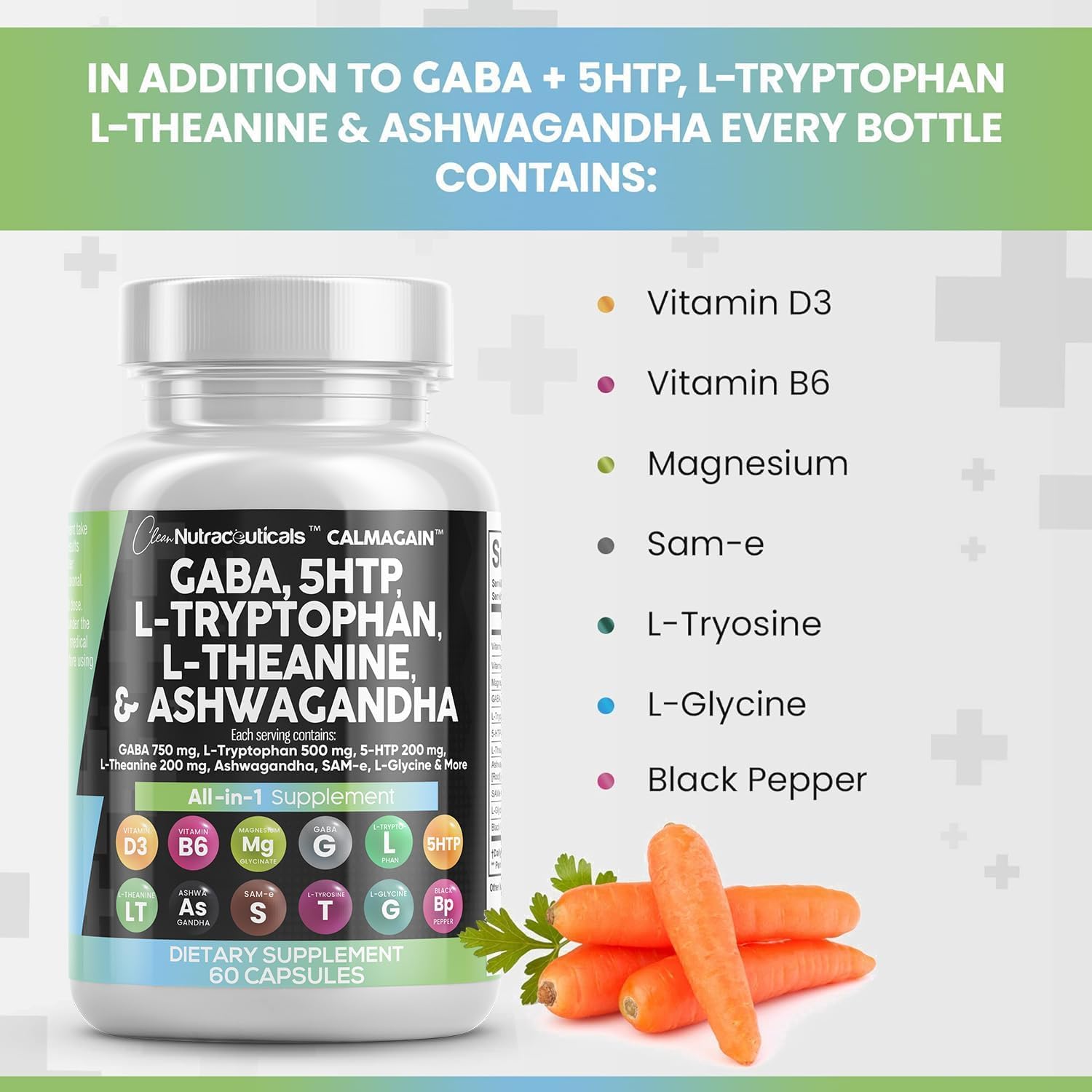 - Introducing the CalmAgain All In One Supplement - In addition to containing large milligram dosages of L-Theanine 200mg and many 5 HTP Supplements, our formula also contains a whopping 750mg of GABA Powder. This is a powerful alternative to GABA 500mg, L Theanine 100 mg, Ashwagandha 1000mg, and less potent Ashwagandha Capsules. Not your average L-Theanine Supplements, Ashwagandha Pills, and 5-HTP Powder.