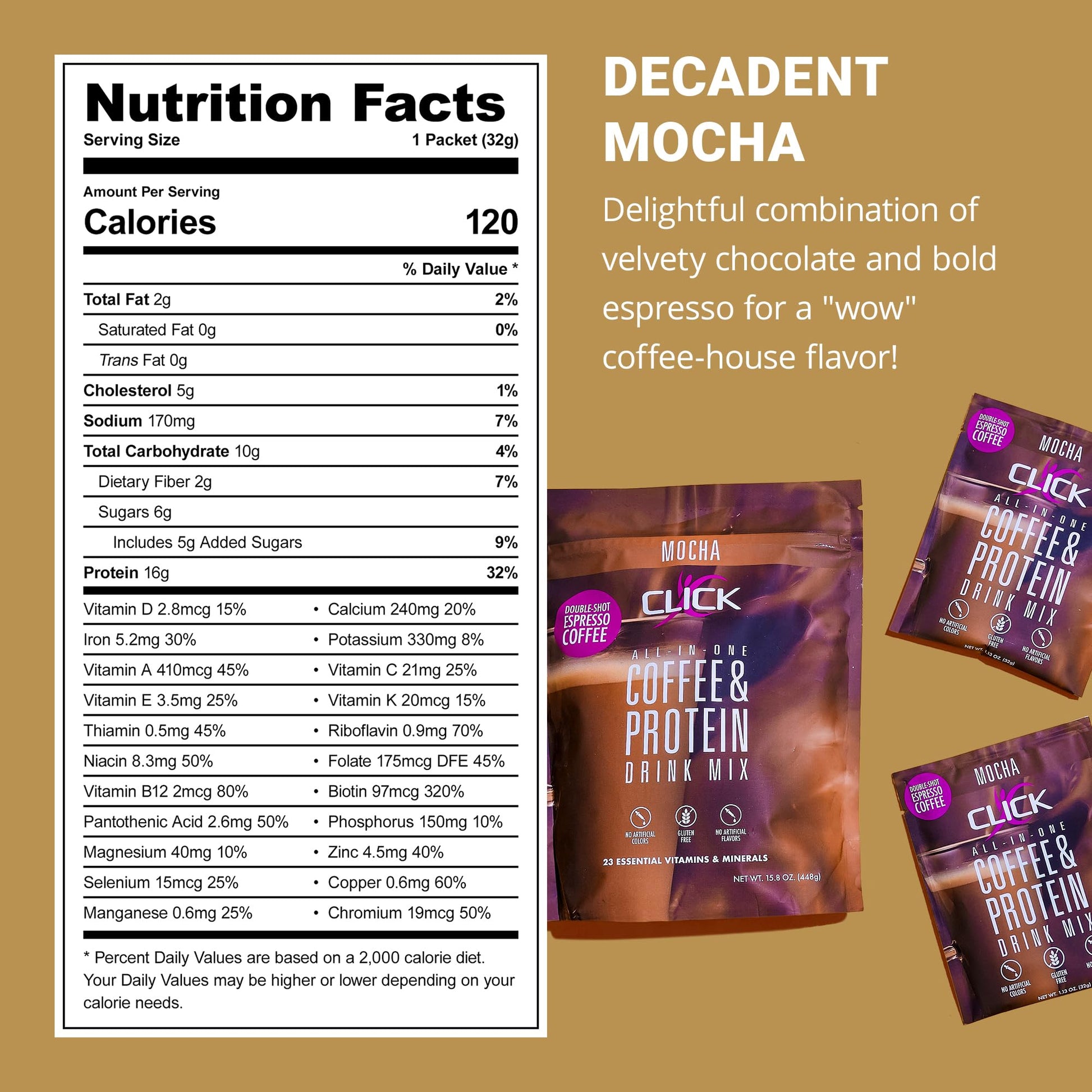 - FEEL FULL LONGER: CLICK Coffee Protein offers one of the highest quality sources of protein available. Every serving provides 16g of protein when mixed with water, or up to 28g when combined with 12 oz fat-free milk. CLICK’s long lasting, slow digesting protein satisfies your hunger for longer periods, while the steady absorption of essential amino acids supports muscle retention, recovery, and growth.