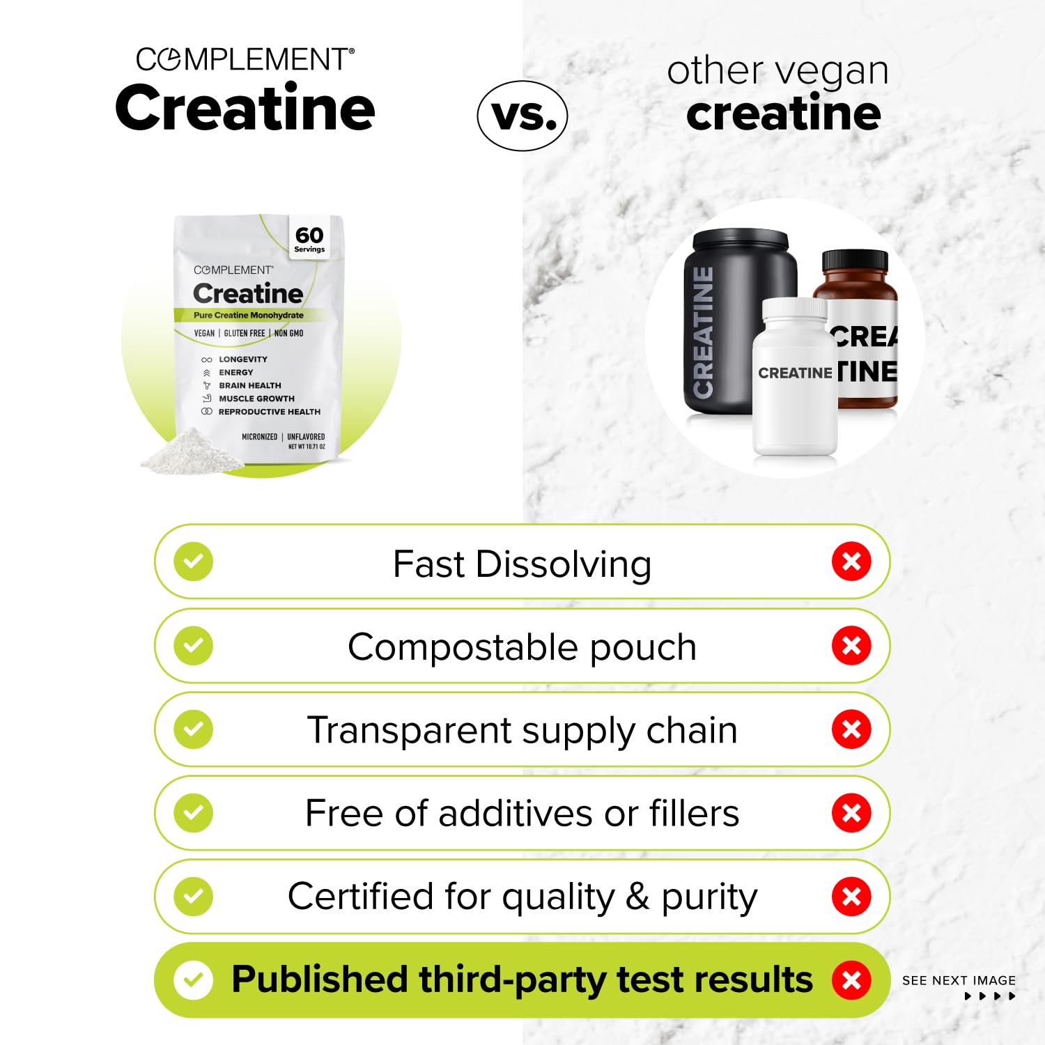 Complement Creatine Monohydrate Micronized Powder for Women and Men (5g, 60 Servings) Pre Workout, Post Workout, Muscle Recovery, Brain Health, Longevity- Vegan, Unflavored