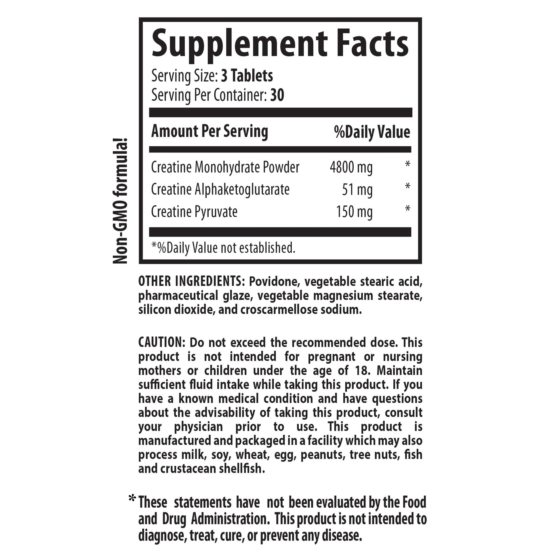 - CREATINE TRI-PHASE: New and Improved Unique Blend of 3 Creatines. Creatine Tri-Phase is a Premium Quality Muscle Volumization Natural Supplement. New, Powerful and Improved formula contains: Creatine Monohydrate Powder, Creatine Alphaketoglutarate, Creatine Pyruvate. (1 Bottle = 90 Tablets per bottle, 30 Servings per container, Serving Size 3 Tablets).