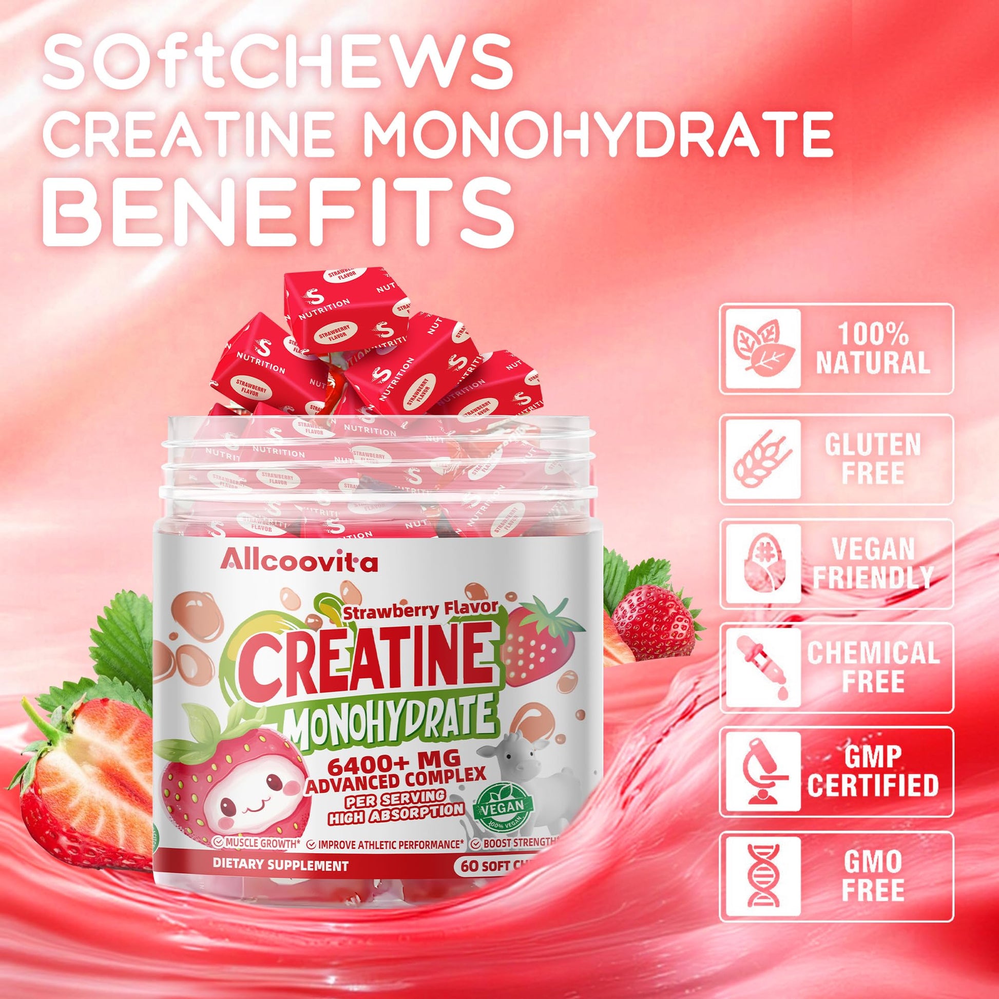 Creatine Monohydrate Chews Complex 6400mg for Men & Women -Advanced Formula W/L-Taurine + Vitamin B12, Sugar Free Chewable Supplement,60 Strawberry Softchews