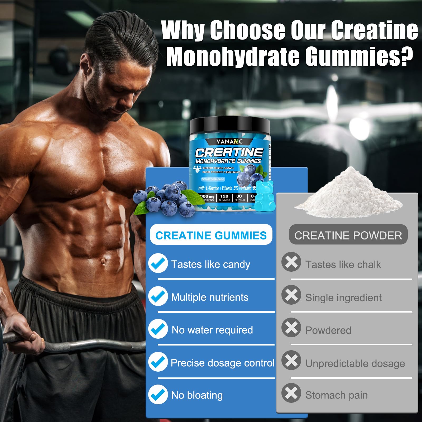 Creatine Monohydrate Gummies 5000g for Men Women, Sugar Free Chewables Creatine Pre-Workout Supplement with L-Taurine + Vitamins for Muscle Strength, Boost Energy & Endurance,120 Gummies-Blueberry