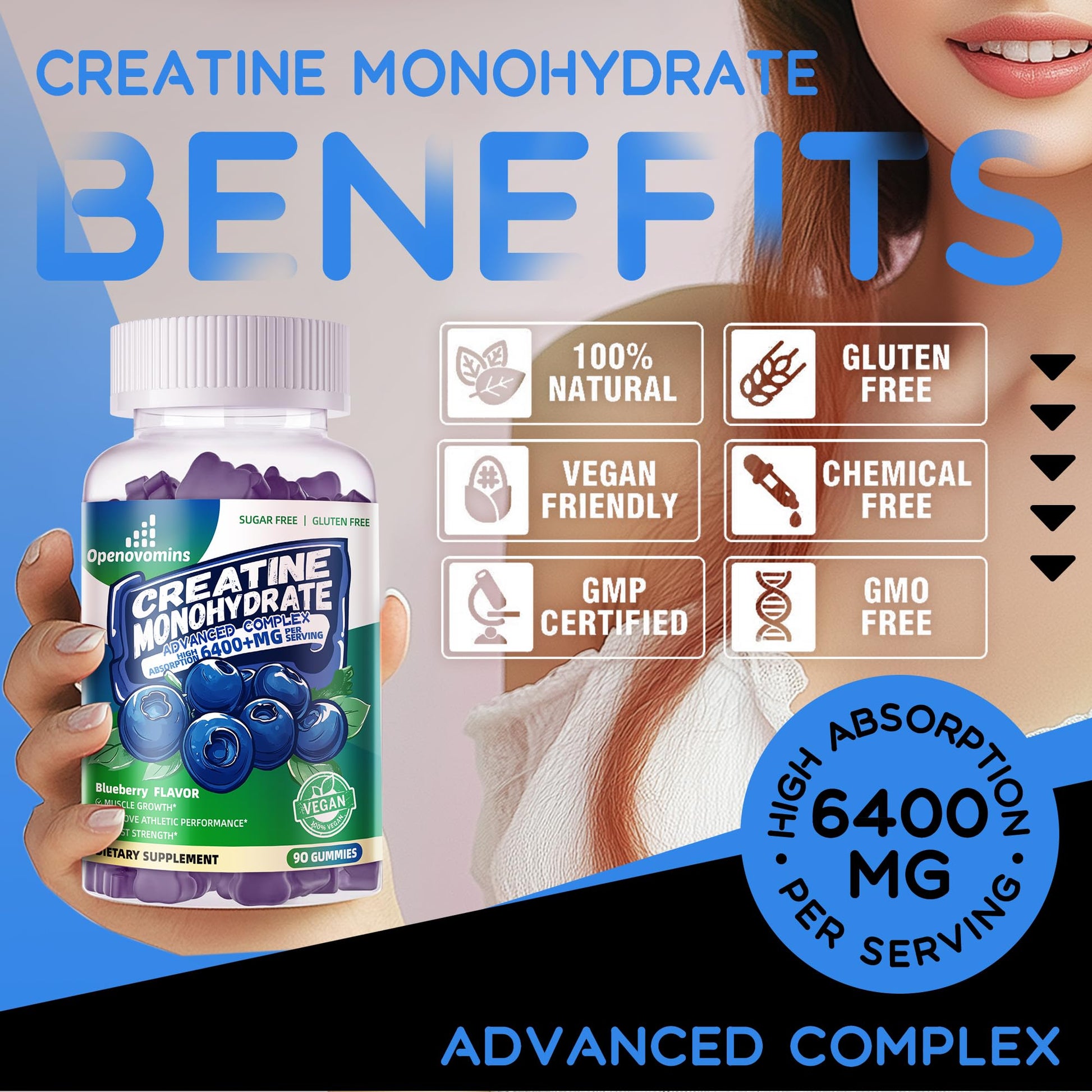 Creatine Monohydrate Gummies Complex for Men & Women -Advanced Formula W/L-Taurine + Vitamin B12, Sugar Free Chewable Supplement,90 Blueberry Gummies