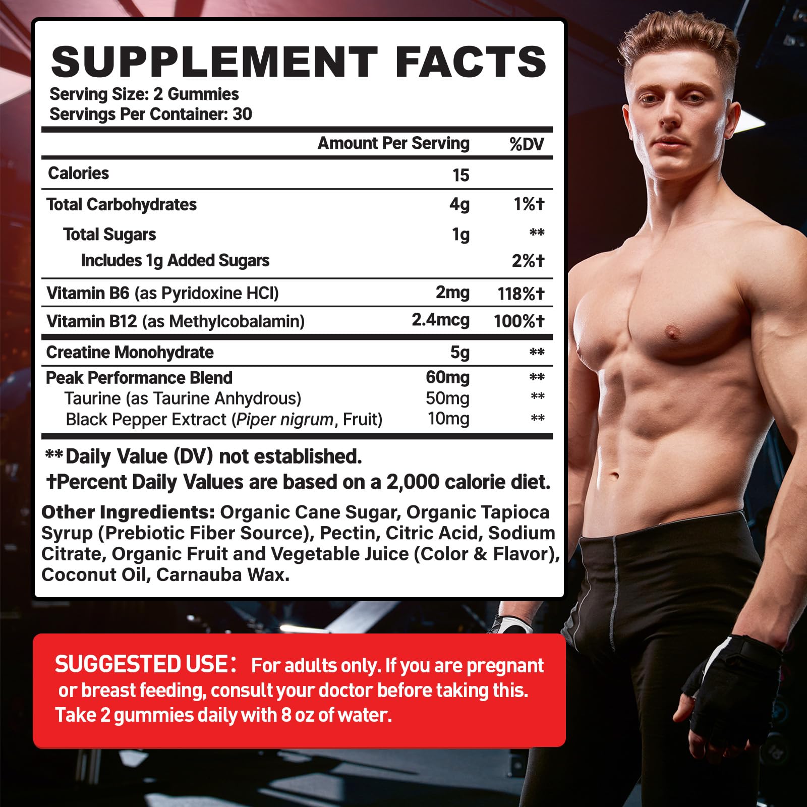 - MAX STRENGTH AND ENDURANCE: Our creatine monohydrate gummies for women and men are infused with organic black pepper extract and taurine to accelerate absorption. Best creatine gummy allow you to train harder, recover faster, and gain the strength and endurance you have been striving for