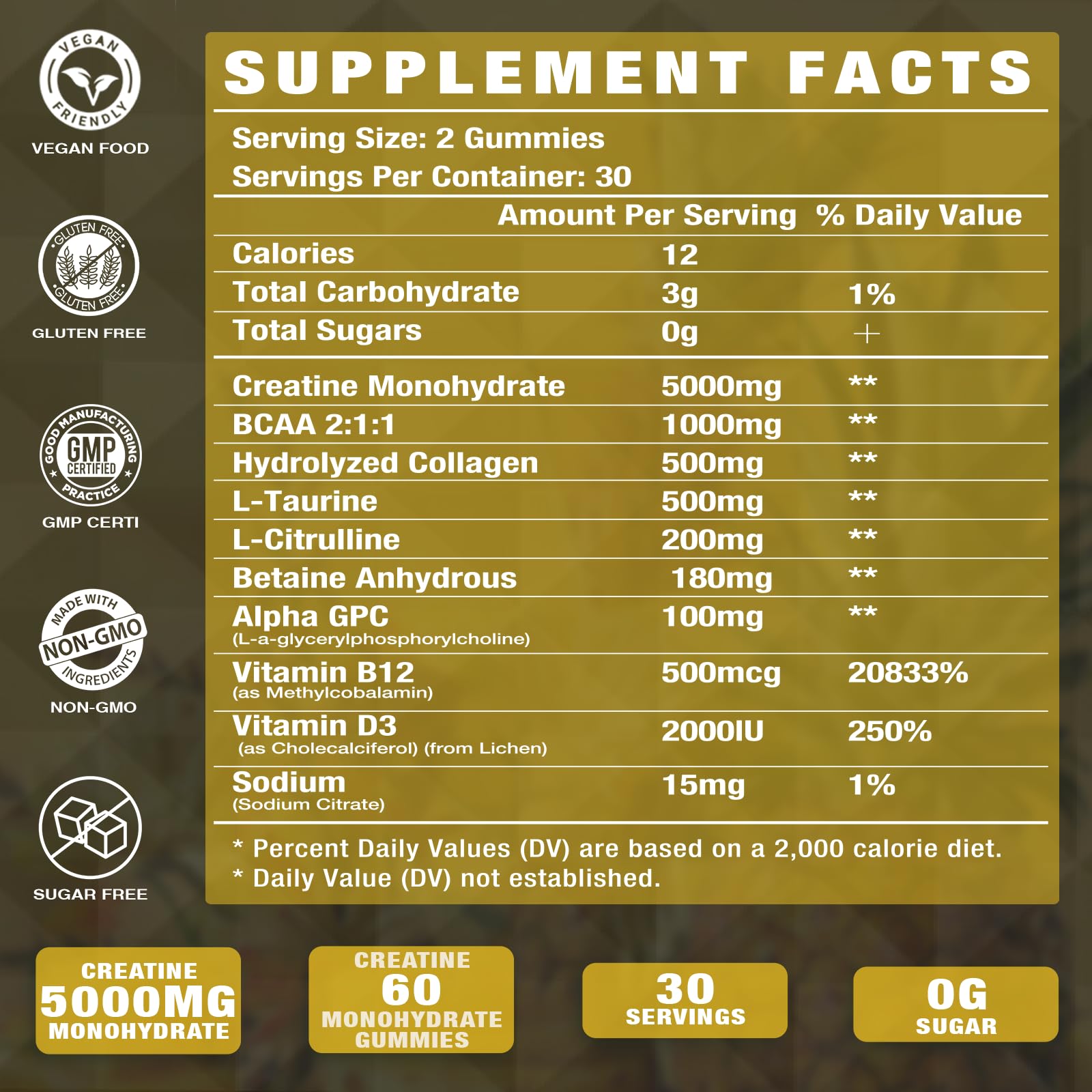 - CREATINE MONOHYDRATE - A WELL-STUDIED SUPPLEMENT: Embrace the essence of vitality with our Creatine Monohydrate Gummies-each bite harbors 500mg of pure creatine monohydrate, 500mcg of brain-boosting vitamin B12, and a whisper of sodium at 15mg. These chewable marvels are crafted to nurture the cognitive tapestry of your brain, weaving threads of clarity and focus.