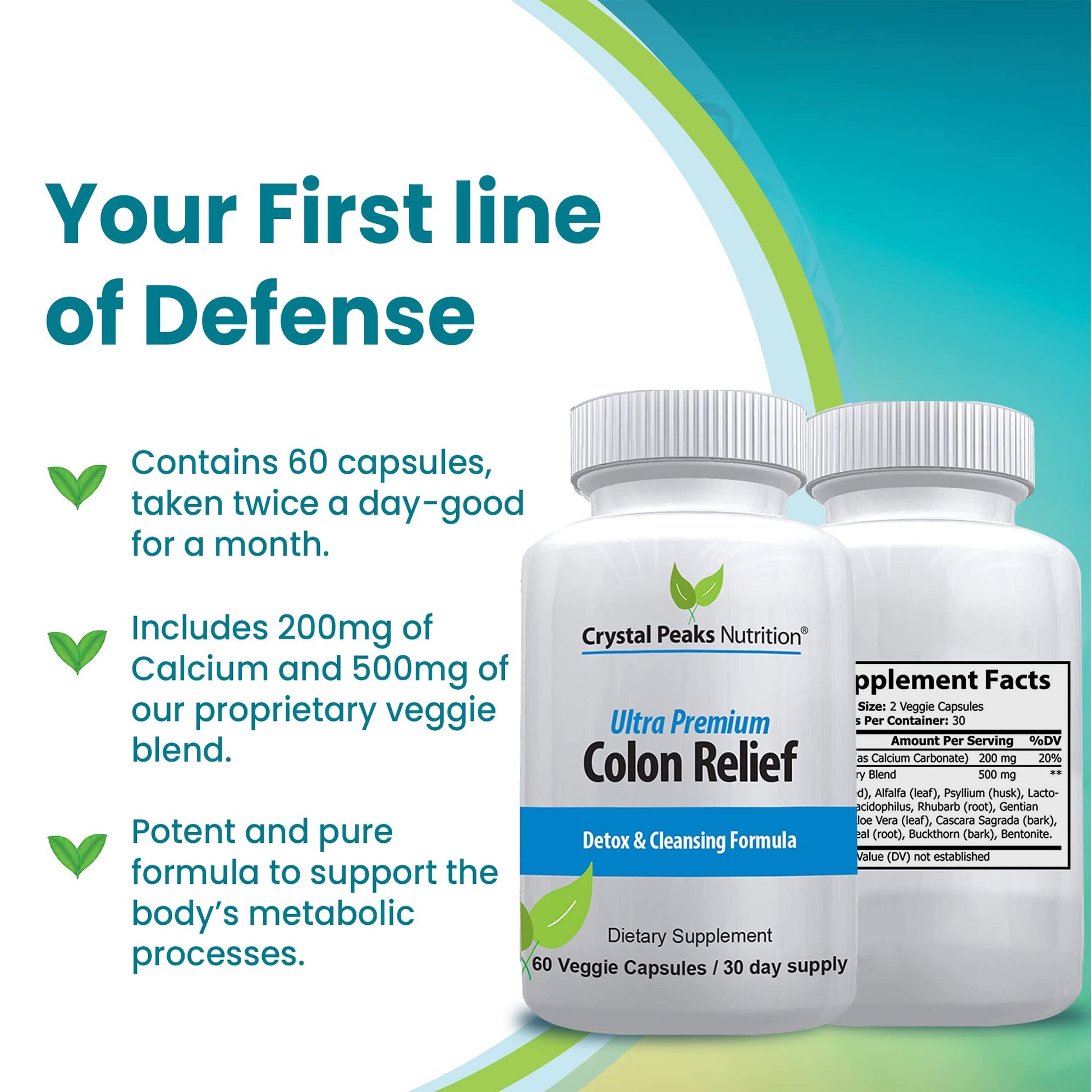 CRYSTAL PEAKS NUTRITION Natural Colon Cleanser Capsules for Constipation Relief and Gut Cleanse Detox - Cascara Sagrada, Psyllium Husk & Bentonite (60 Capsules)
