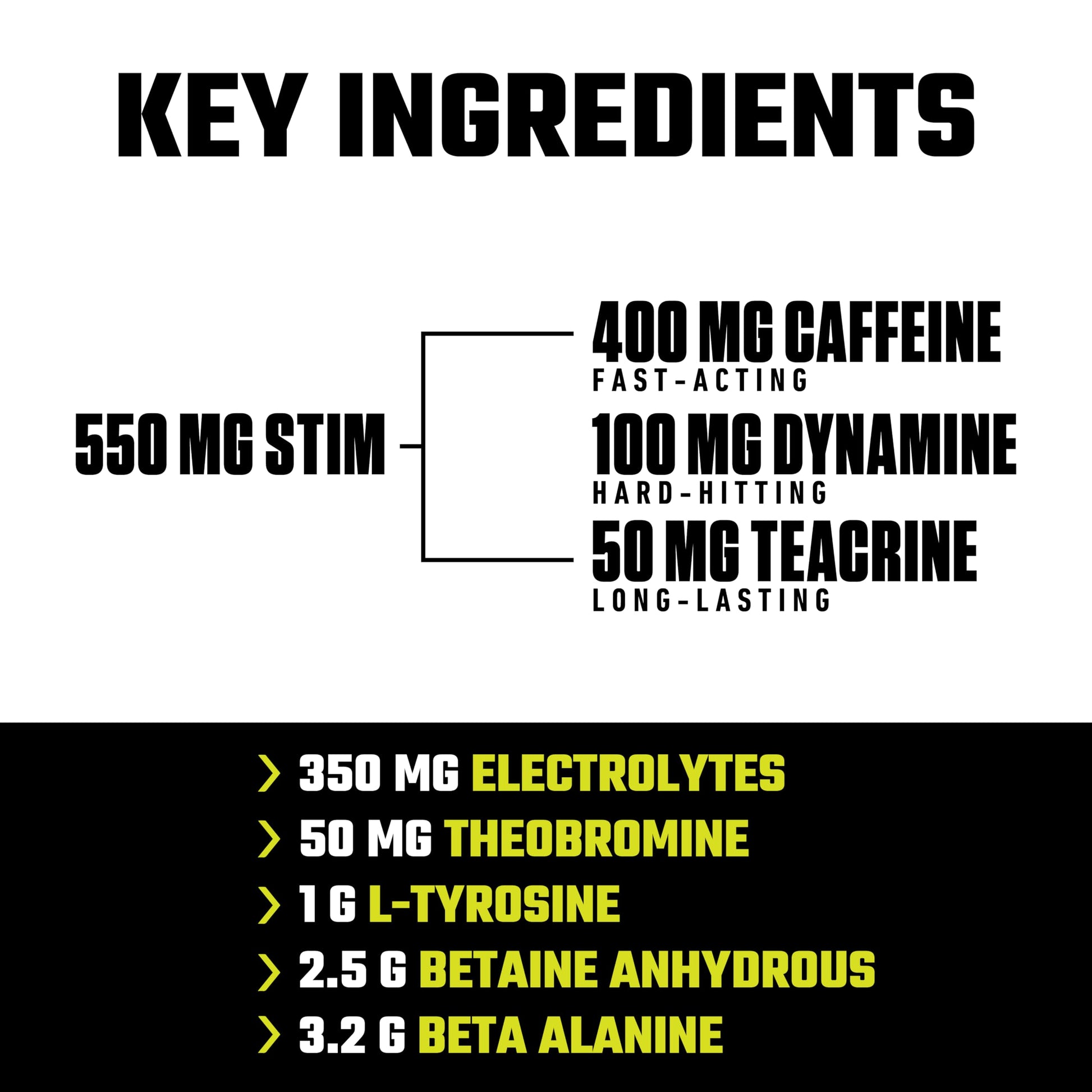 - 550 Milligram Energy Matrix featuring Caffeine Anhydrous, Dynamine, and TeaCrine delivers extremely high energy levels without the crash or jitters