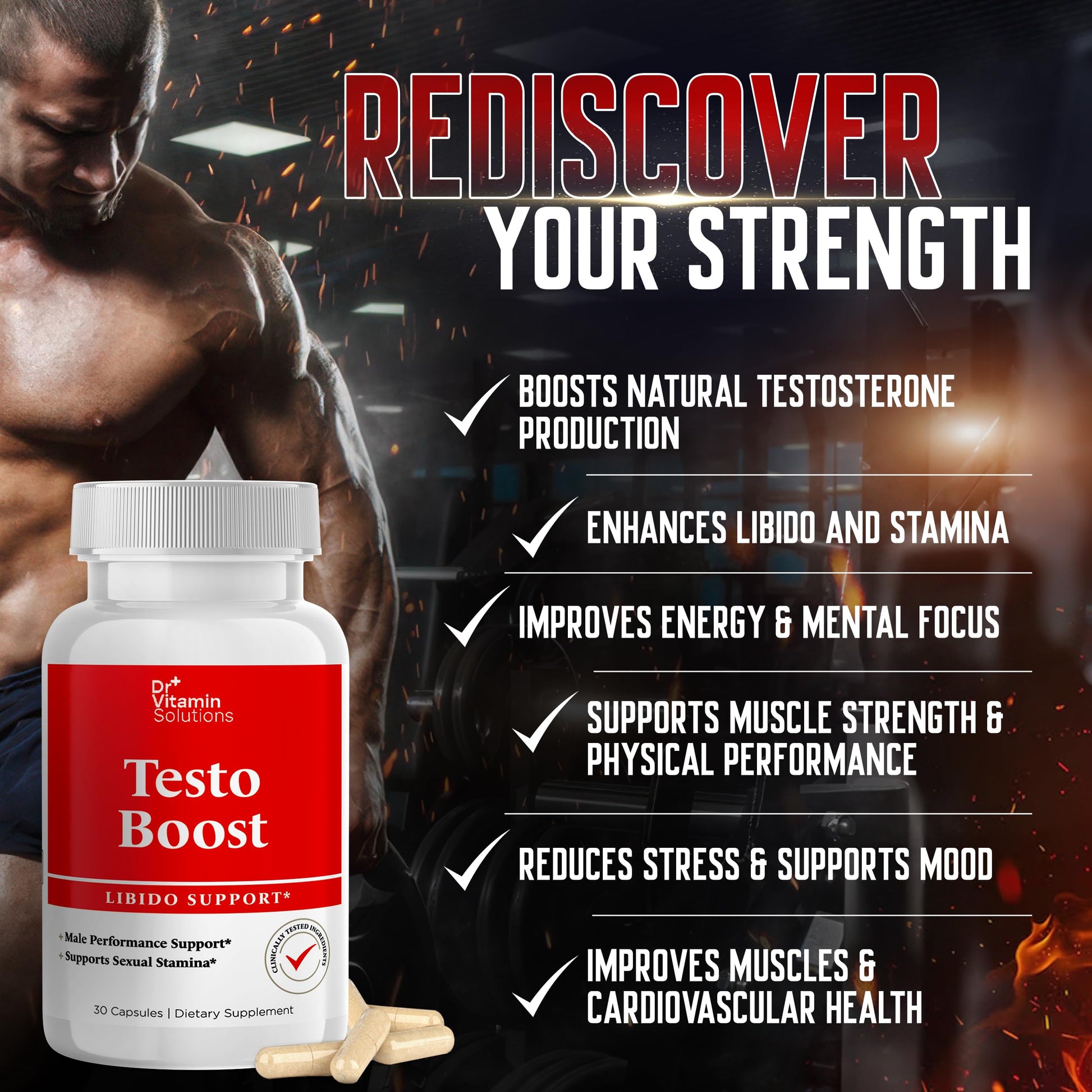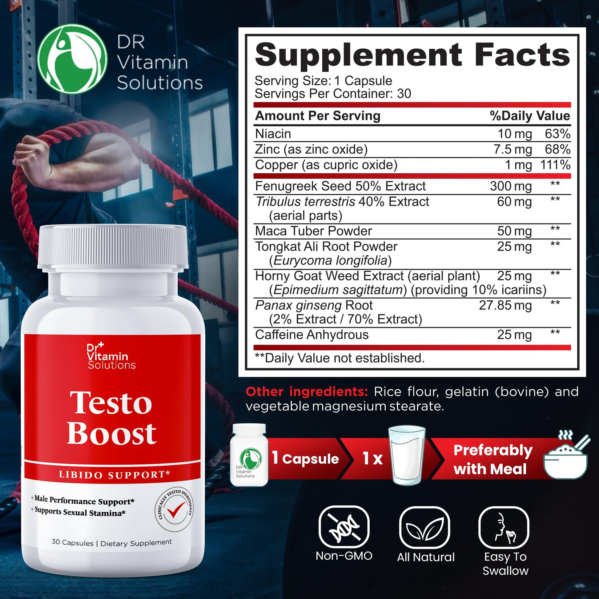 Dr. Vitamin Testo Boost Supplement for Men - Stamina, Endurance & Energy Enhancement - Male Testosterone Booster w/ Fenugreek, Tribulus, Tongkat Ali, Horny Goat Weed - 30 Capsules
