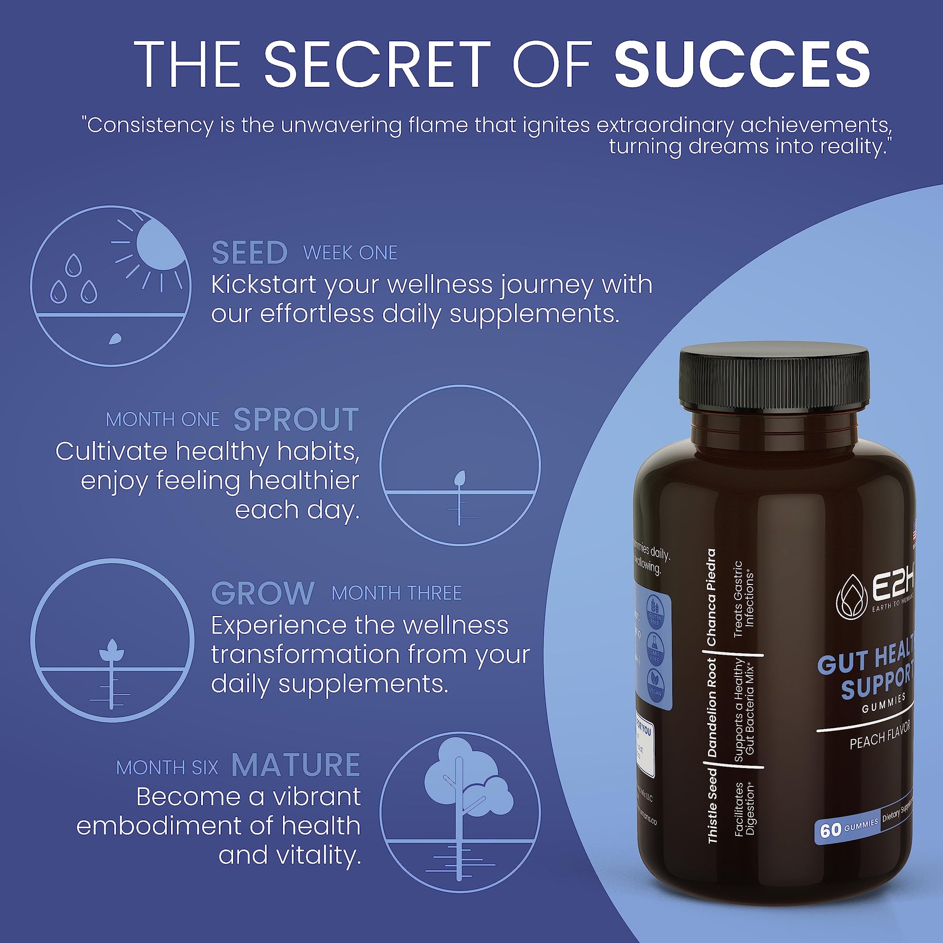 - VEGAN, NON-GMO, GLUTEN-FREE & GELATIN-FREE: Our E2H Gut Support Gummies come in a pack of 60 and adhere to vegan, non-GMO, gluten-free, and gelatin-free standards, making them an excellent choice for various lifestyle preferences, ensuring health without any dietary compromise.