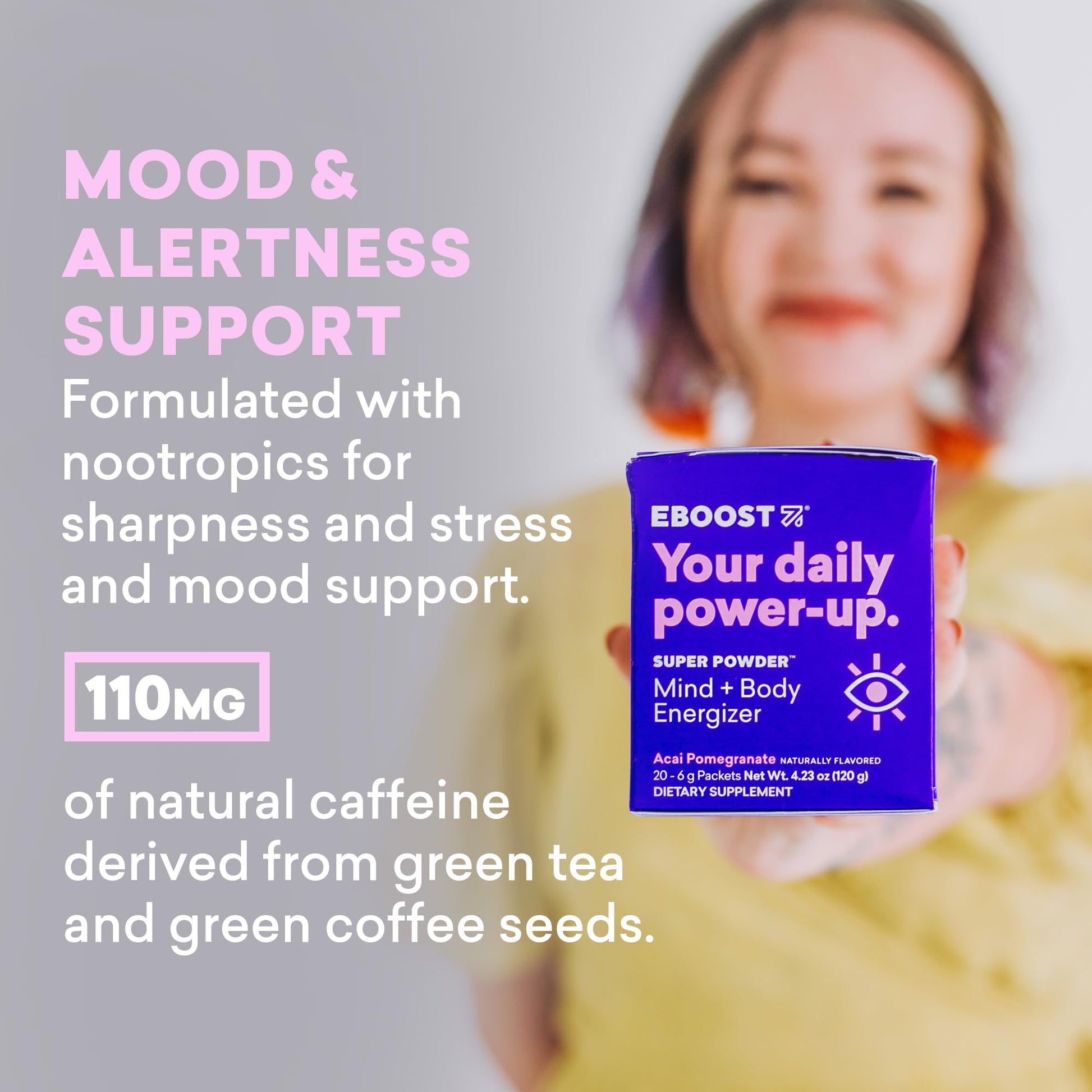 - Focus And Mood Amplifier: The OG formula that started it all, EBOOST SUPER POWDER is an all-in-one little packet that holds up to its name. Experience natural daily wellness with our transformative formula that offers energy, vitamins, minerals, antioxidants, electrolytes, and mood and alertness support. Flavor: Acai Pomegranate