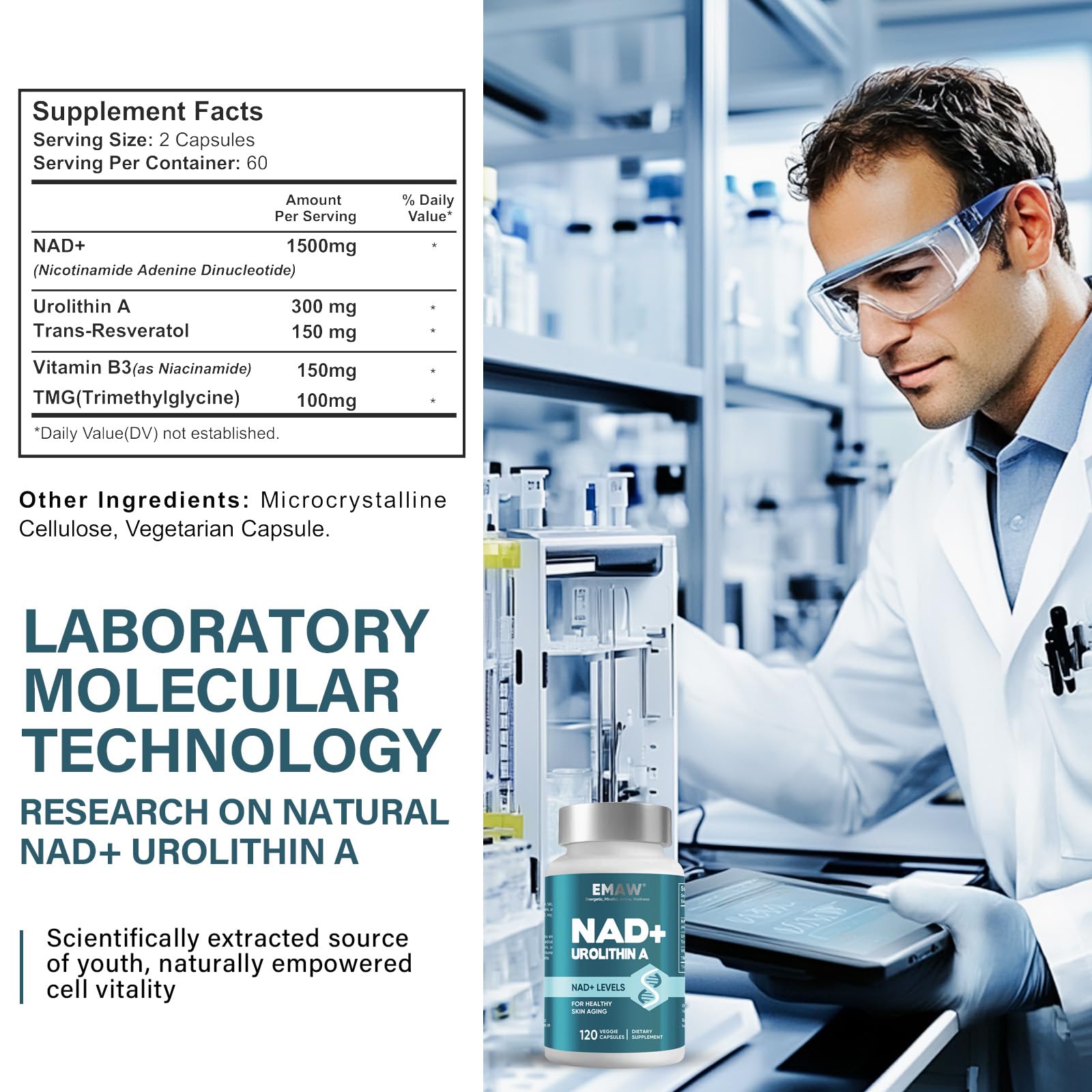 EMAW NAD+ Supplement 1500MG, 120 Capsules with Urolithin A 300MG, NMN Alternative Supports Anti Aging, Powerful Complex Blend for Cellular Repair & Brain Boost