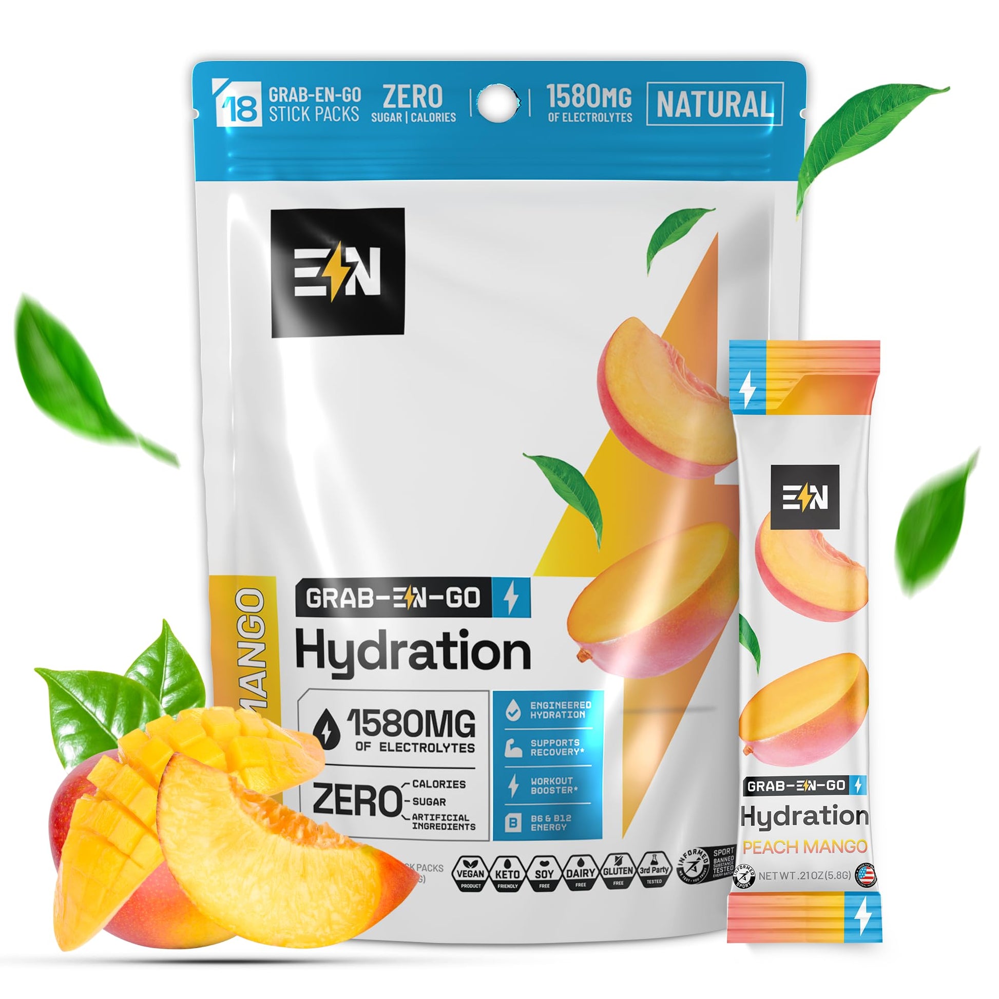 EN Engineered Nutrition, Sugar-Free Electrolytes Powder Packets - Keto Electrolytes Hydration Packets, Single-Serving Electrolytes, No Calories, Vegan, Non-GMO, Organic, Gluten-Free, Peach Mango 18 CT