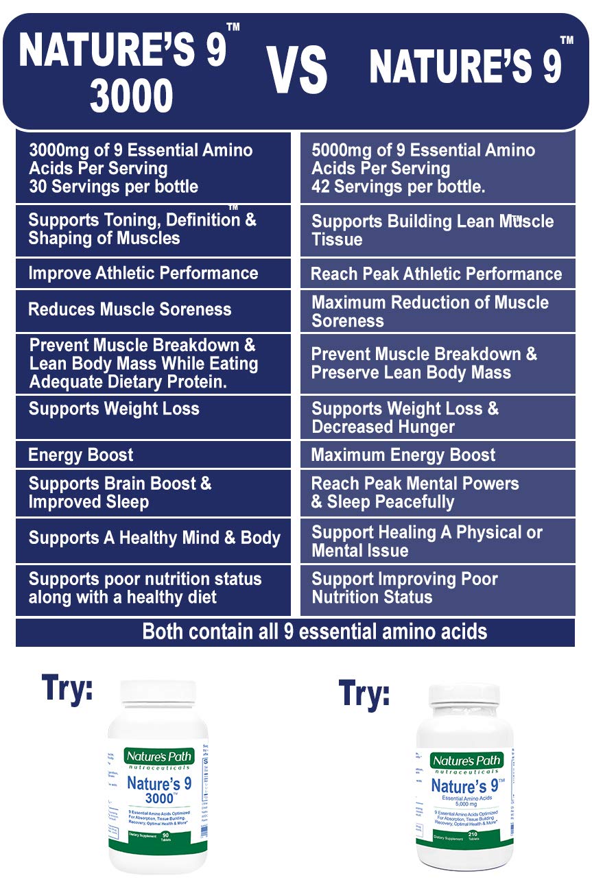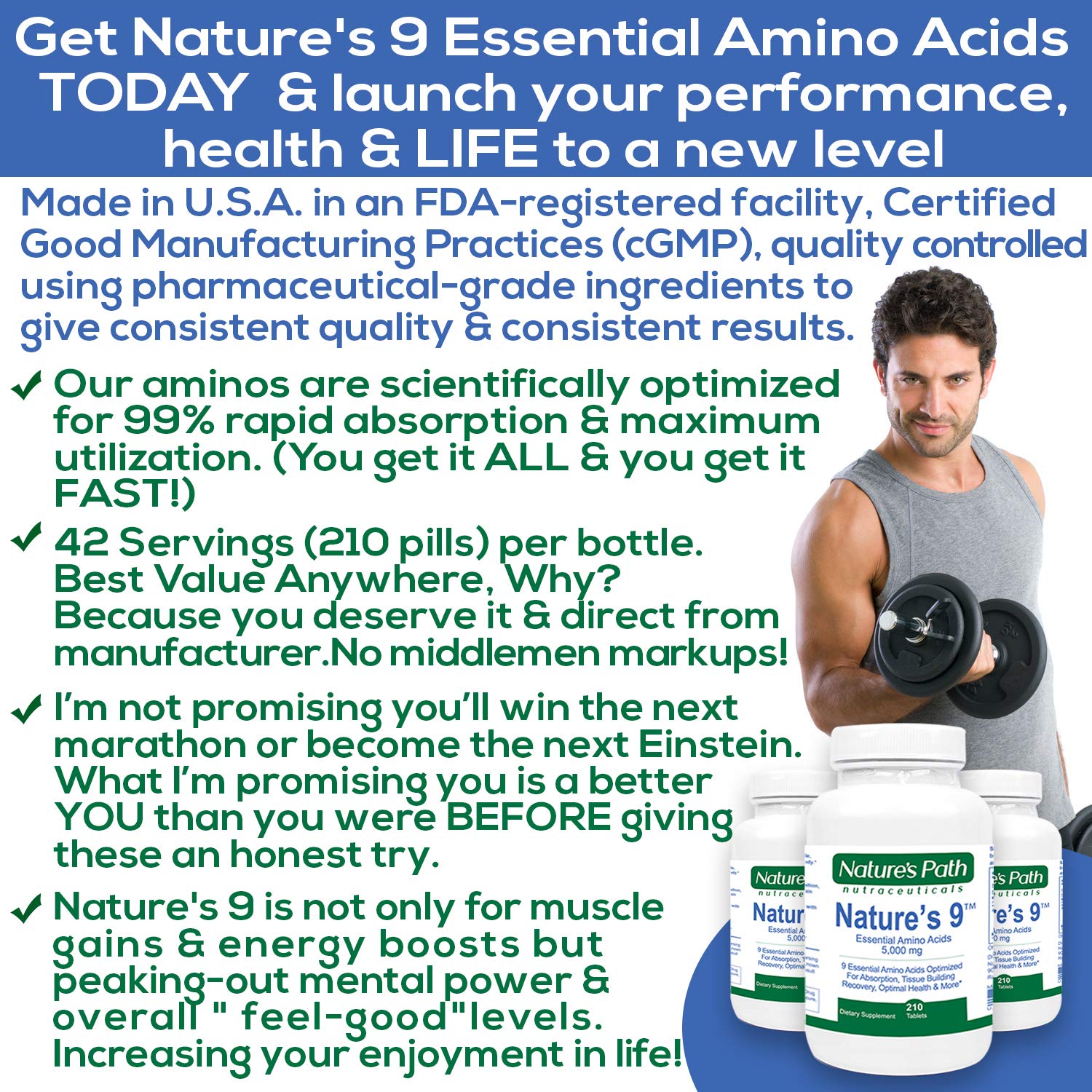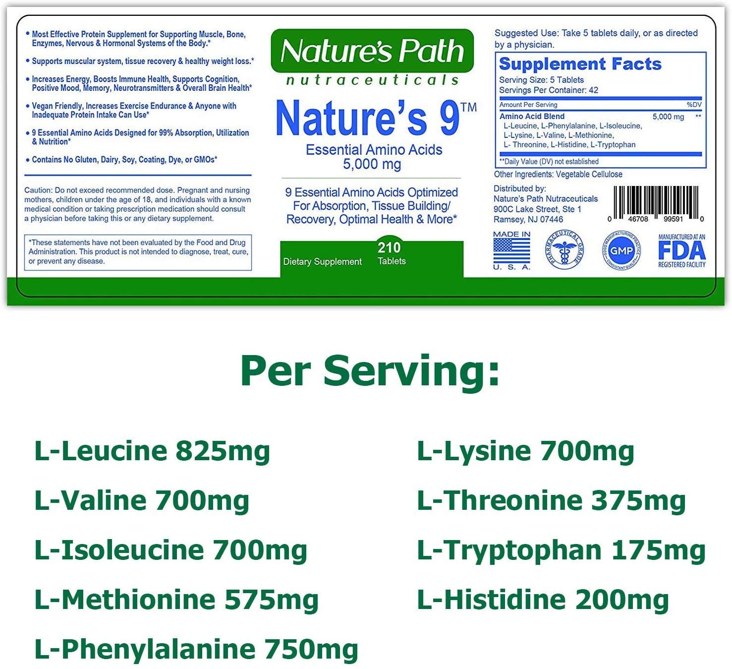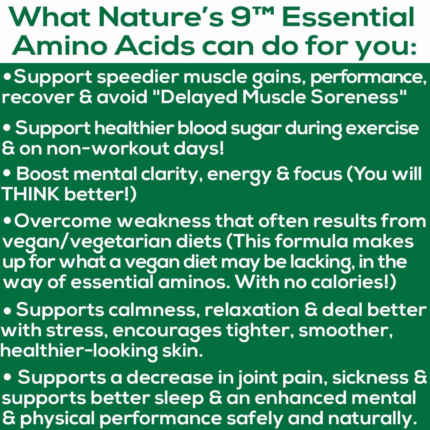 - Nature’s 9 has special ratio of essential amino acids in one supplement for optimal support of protein synthesis, growth, metabolism & for every process. Per pill. L-Leucine 165mg, L-Isoleucine 140mg, L-Methionine 115mg, L-Phenylalanine 150mg, L-Valine 140mg, L-Lysine 140mg, L-Threonine 75mg, L-Tryptophan 35mg & L-Histidine 40mg. A Vegan BCAA & EAAS amino acid complex to enhance your workouts, health & how you feel. Order right now and start helping your health & workouts today.
