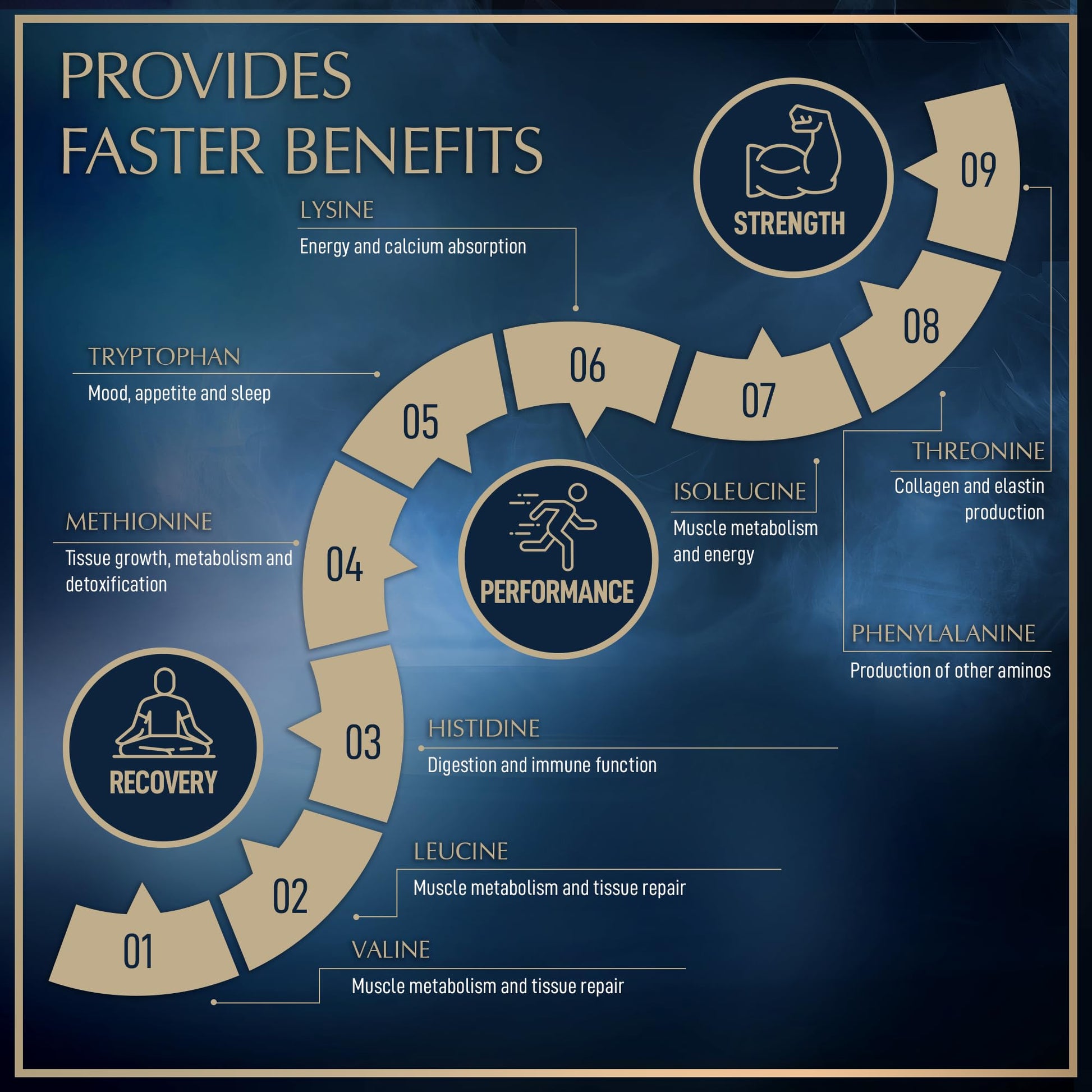 - COMPLETE AMINO ACID COMPLEX. All 9 pure bcaas amino acids: histidine, isoleucine, leucine, lysine, methionine, phenylalanine, threonine, tryptophan, valine. Branch chain amino acid supplement to support your health and fitness goals.