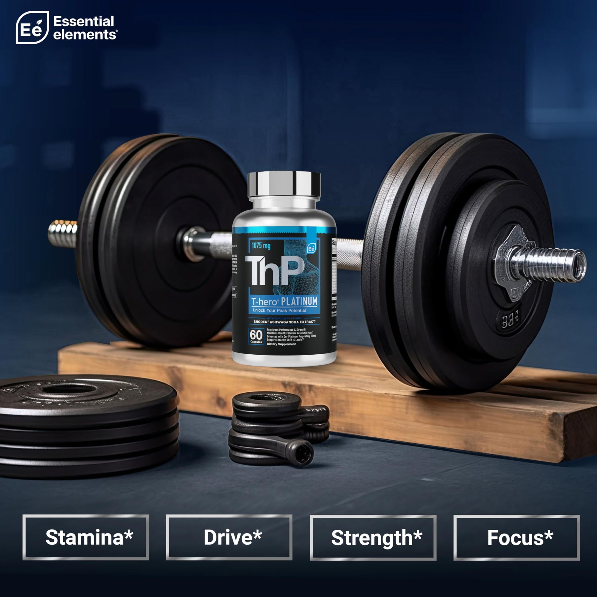 Essential Elements T-Hero Platinum Male Health Supplement for Mens Health - Muscle Growth Support & T-Health with Shoden Ashwagandha, Shilajit, DIM & More - Gym Supplements for Men - 60 Caps