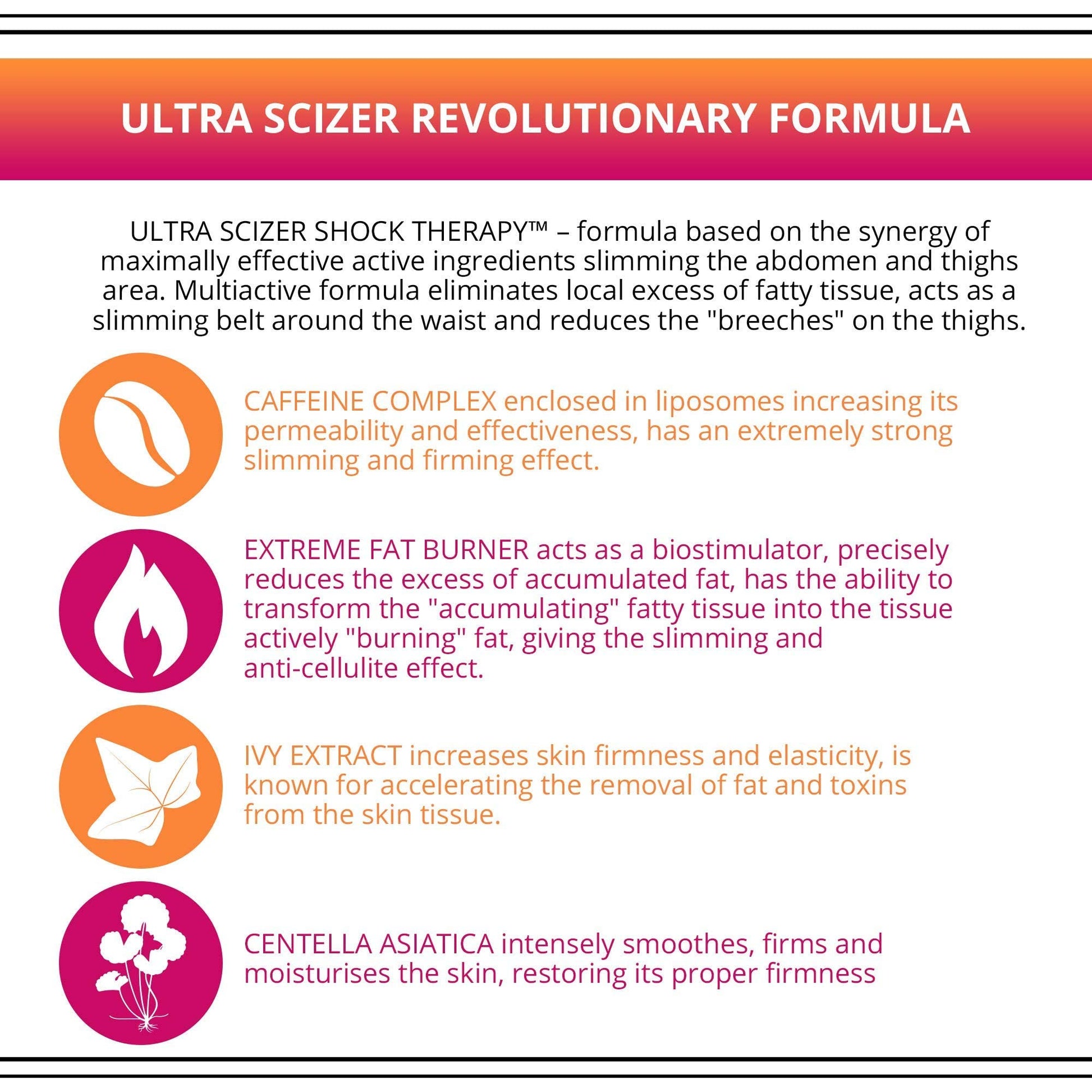 - ULTRA SCIZER SHOCK THERAPY - formula based on the synergy of maximally effective active ingredients slimming the abdomen and thighs area. Multiactive formula eliminates local excess of fatty tissue, acts as a slimming belt around the waist and reduces the "breeches" on the thighs.