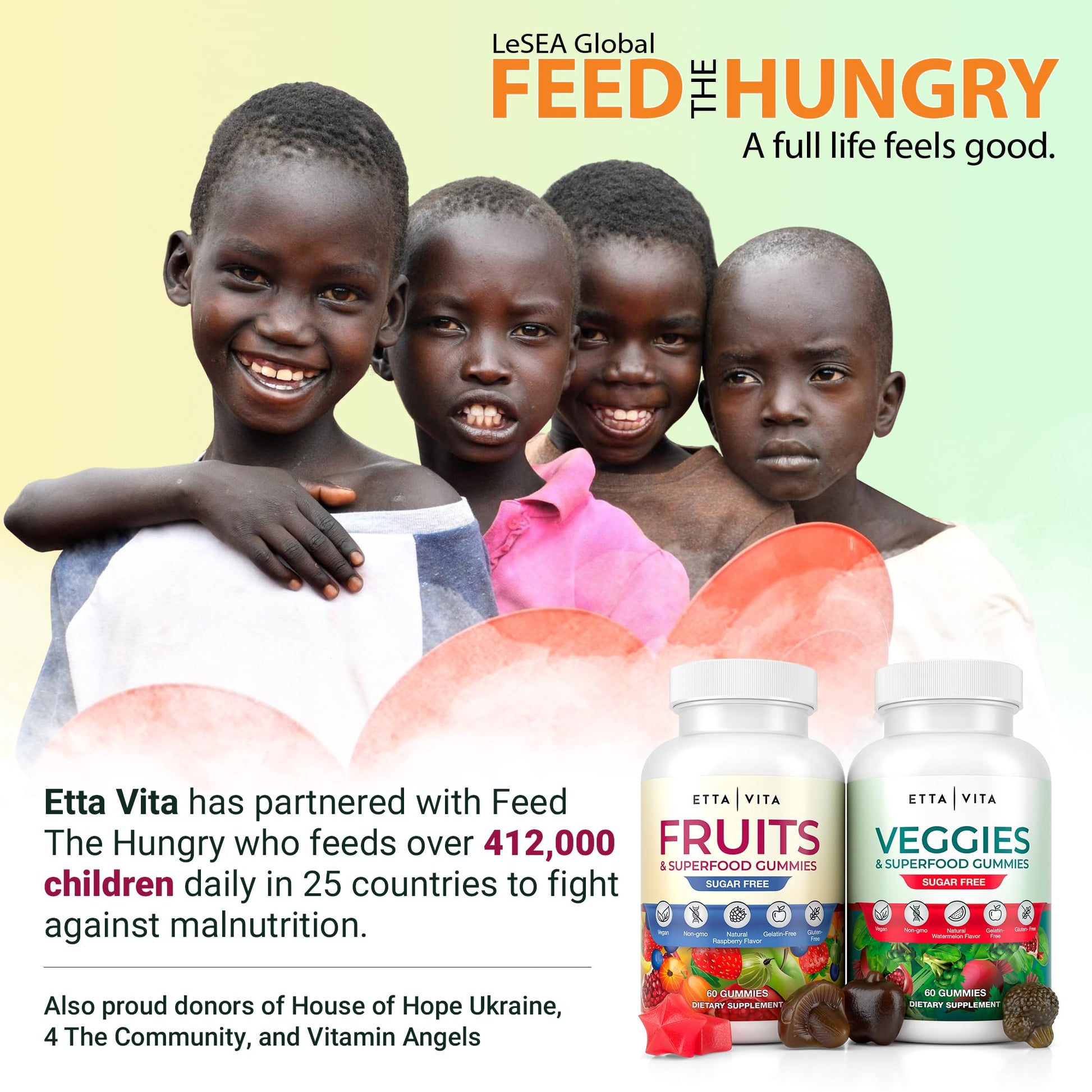 - [Superfood Powerhouse] Maintaining a healthy diet can be challenging with a busy schedule, but not anymore with Etta Vita. Our sugar-free fruit and veggie gummies with a blend of nutrient-rich superfoods provide a convenient and delicious way to incorporate essential vitamins and minerals into your daily routine and support your overall well-being.