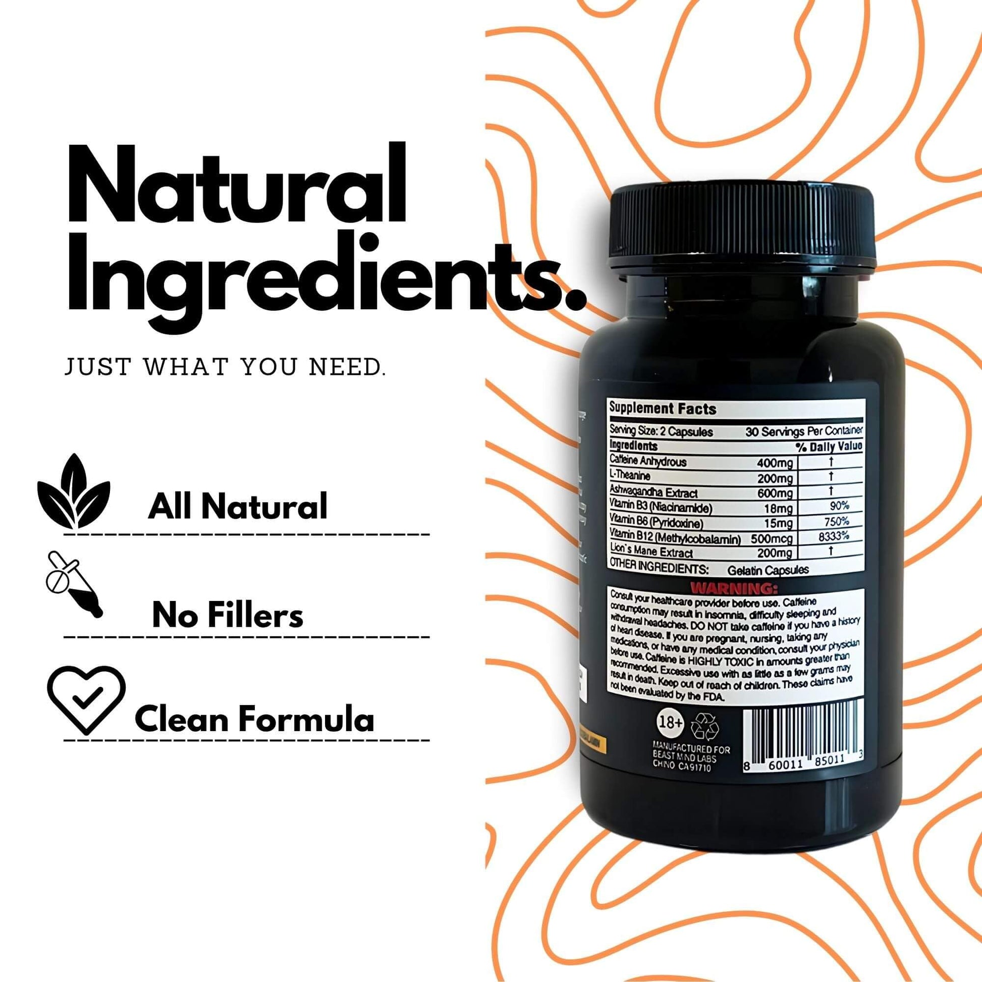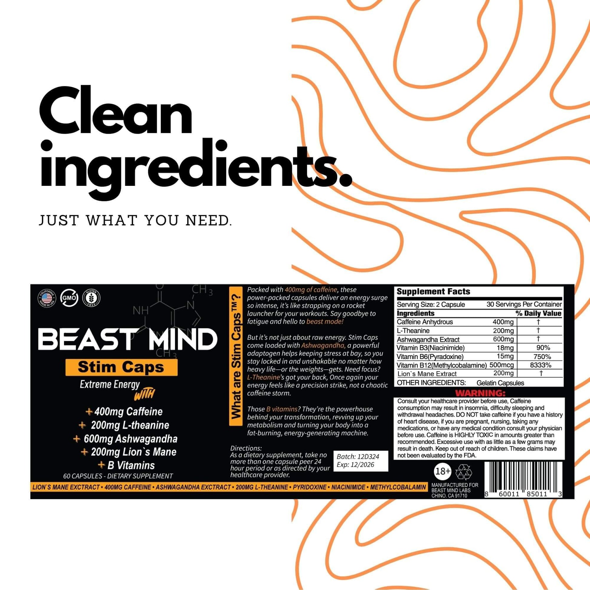 - ALL NATURAL PRE-WORKOUT SUPPLEMENT. Beast Mind labs Extreme Energy Pills, the all-natural pre-workout supplement that delivers a powerful boost of 400mg of natural caffeine per serving. Designed for health-conscious athletes, this organic pre-workout is packed with earth-grown Nootropic Stack like Ashwagandha and essential B vitamins to support overall well-being. Experience extreme energy and focus without the cheap stimulants and chemicals found in most pre-workout supplements. Beast Mind labs Extreme Energy Pills are specially formulated to provide you with the energy boost you need to get in the zone.
