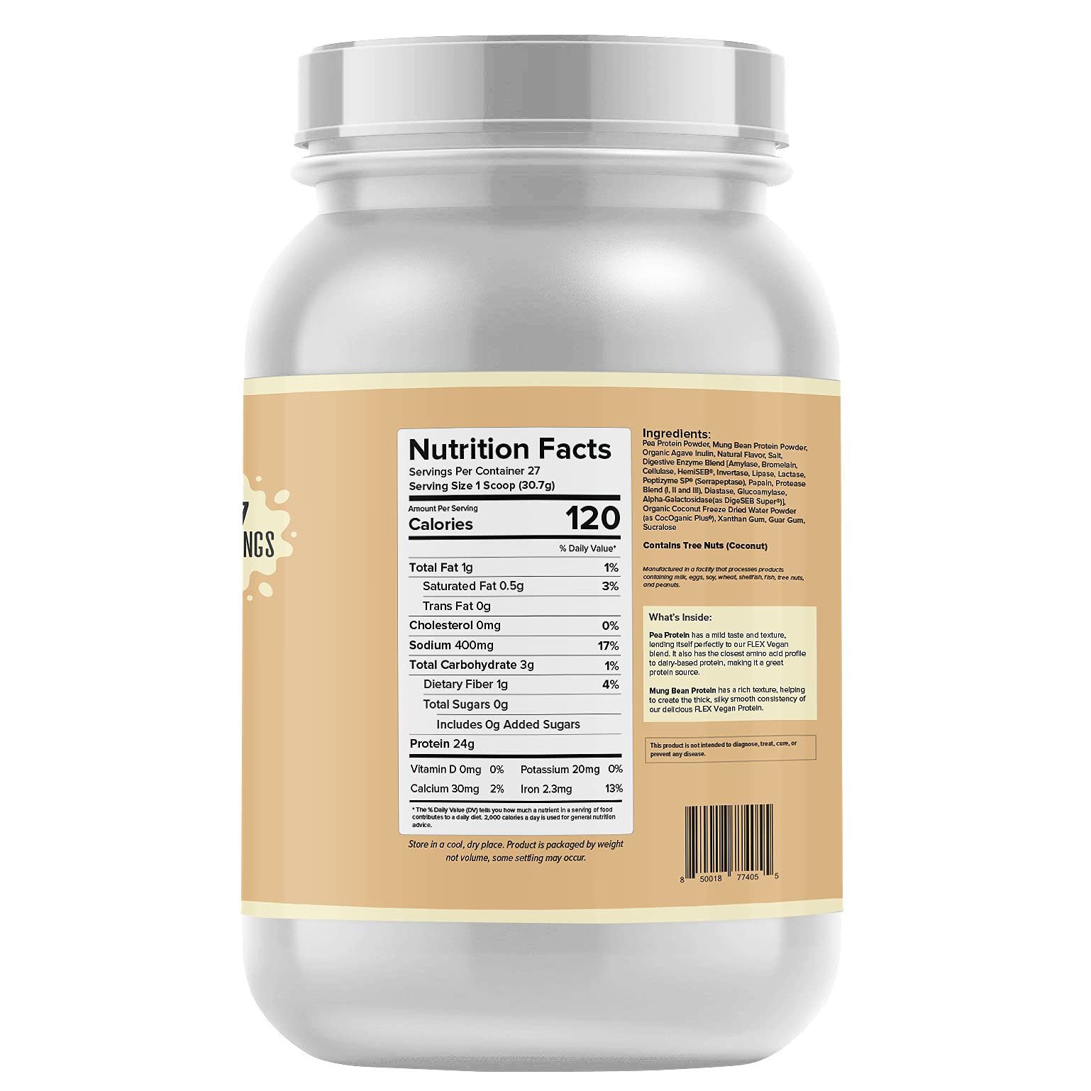 - 24 grams of plant based protein (pea, brown rice, chia seeds), 1 gram of dietary fiber, low net carbs, 0 grams of added sugar, 120 calories per serving