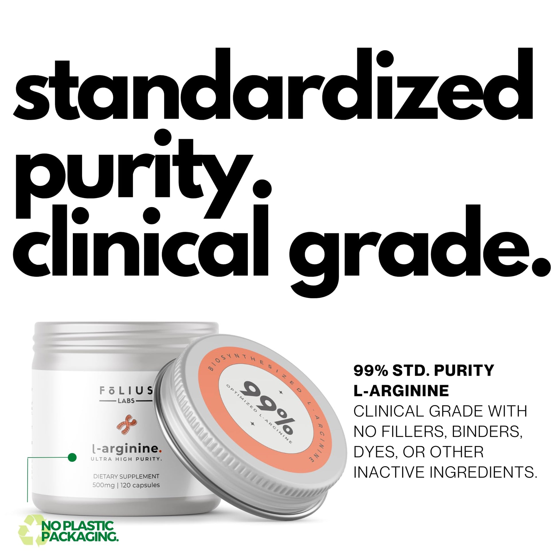 - Clean Label: Our L-Arginine supplement is 100% clean label, free from fillers, additives, preservatives, or artificial ingredients. It is delivered in a pharmaceutical-grade dosage encapsulated in vegetable capsules for purity and quality.