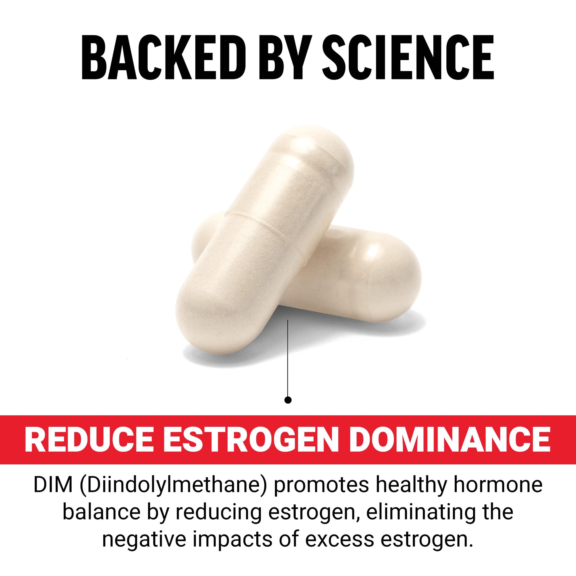 - DECREASE ESTROGEN: DIM, short for dinndolymethane, is a unique compound believed to help decrease estrogen levels in men. At concentrated amounts, DIM is thought to work by inhibiting the enzyme responsible for converting testosterone into estrogen.