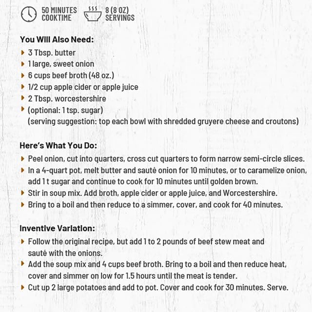 - Requires Additional Fresh Ingredients like 1 large onion, apple juice or cider, sugar and Broth • Please see the back panel of the product