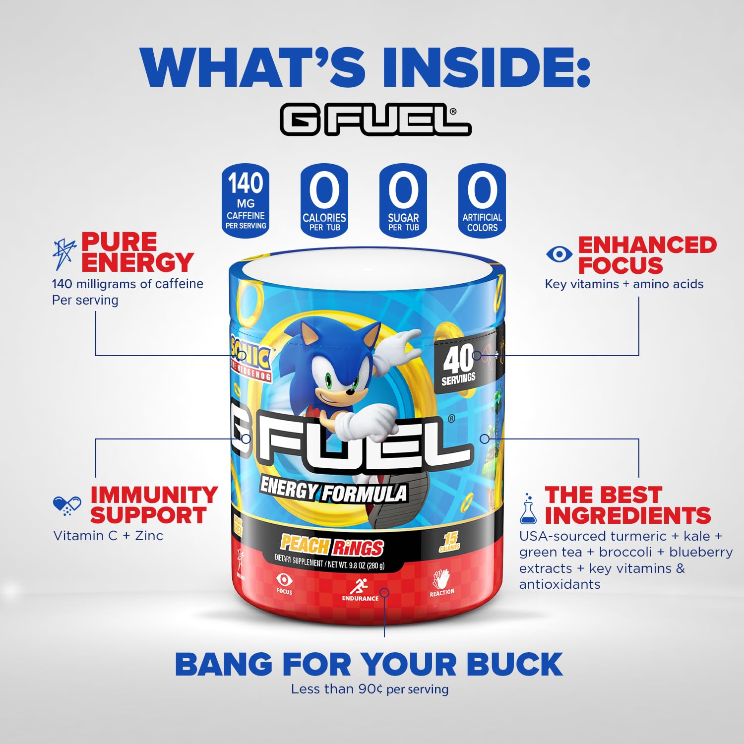 - INSPIRED BY SONIC: Introducing G Fuel's Peach Rings Energy Powder. Inspired by Sonic The Hedgehog, this energy formula will help give you the power and focus you need to defeat the evil Dr. Eggman and save the world from imminent doom.
