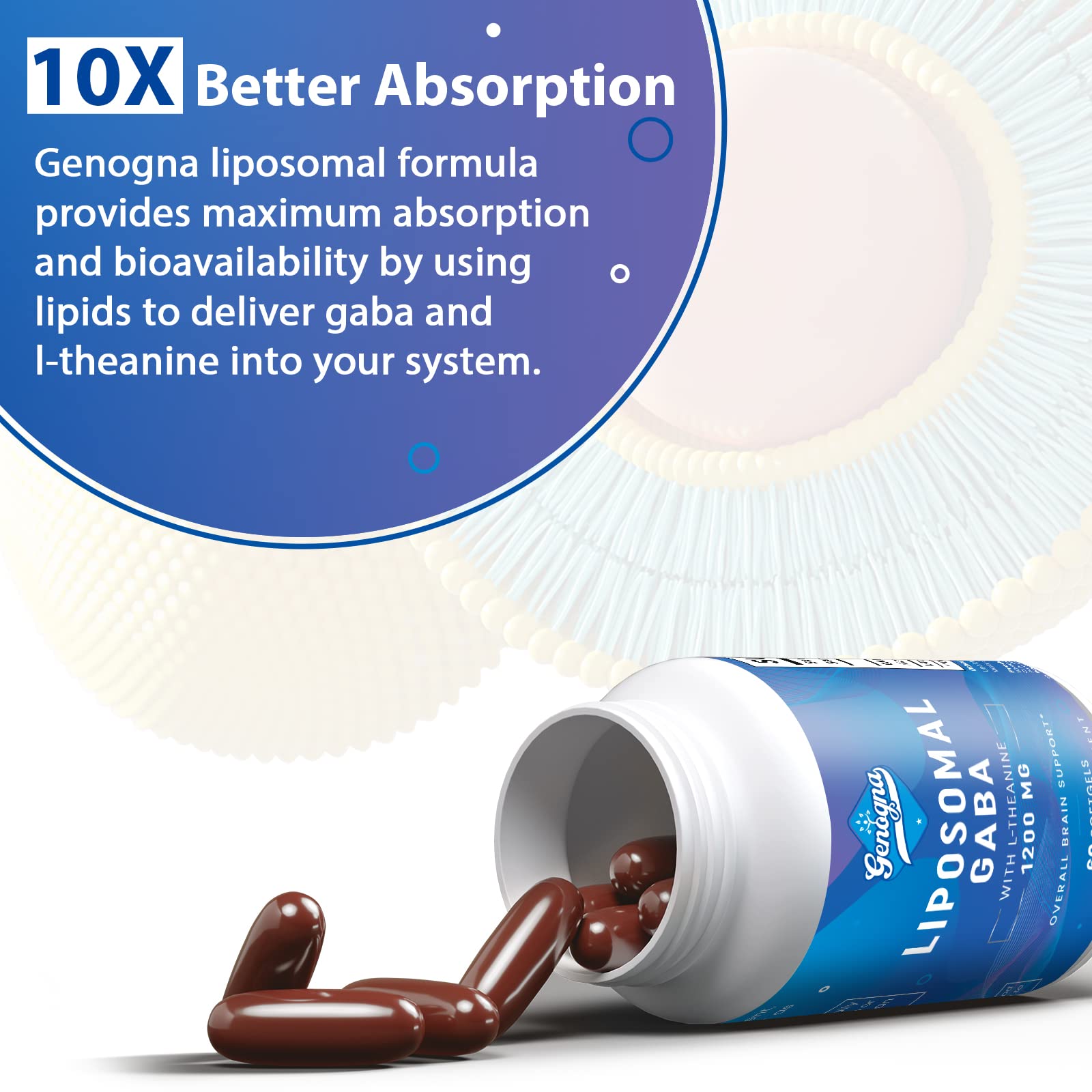 - Greater Absorption: Genogna utilizes Liposome technology to improve absorption, allowing your body to utilize 10x more GABA and L-Theanine compared to traditional pills or powder