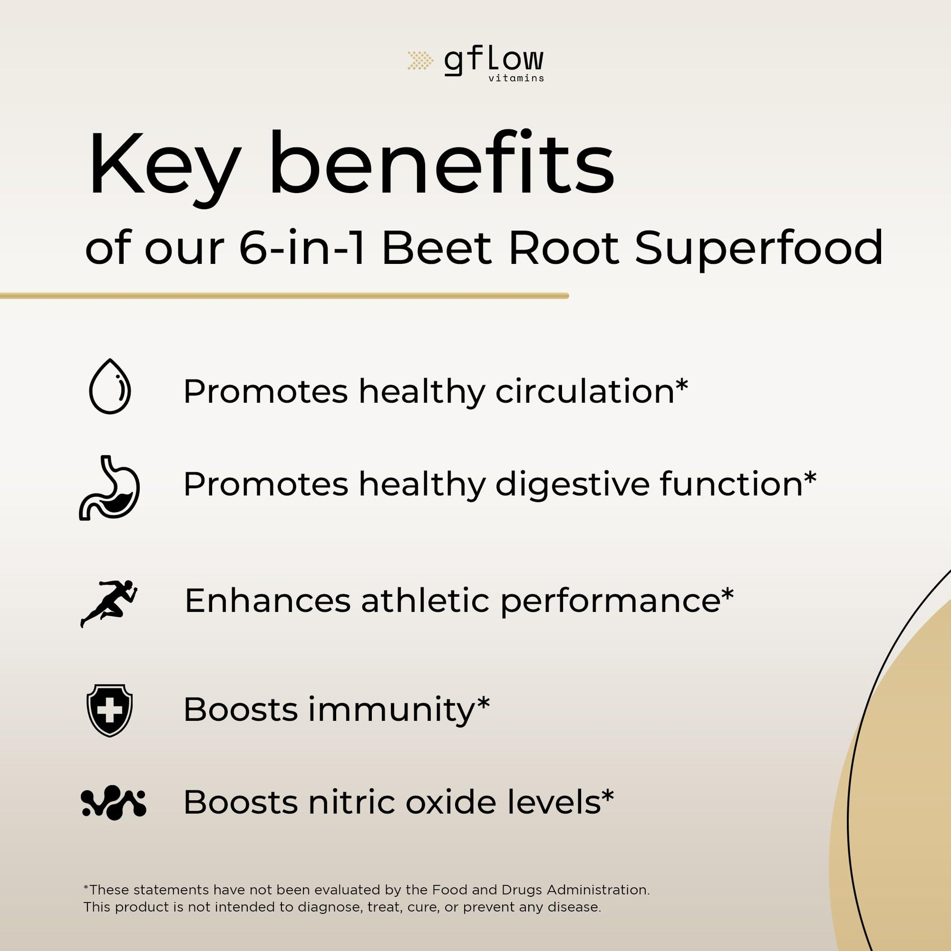- MULTIFUNCTIONAL AND EXTRA STRENGTH FORMULA: Gflow Vitamins Beet Root Extra Strength supplement is a powerful compound to improve performance and boost overall good health and well-being. It is designed to help to improve the body's digestive system, and help to provide immune support. You can uplift your energy, focus, and recovery time with the 8000 mg daily dose of potent 20:1 concentrated beetroot extract