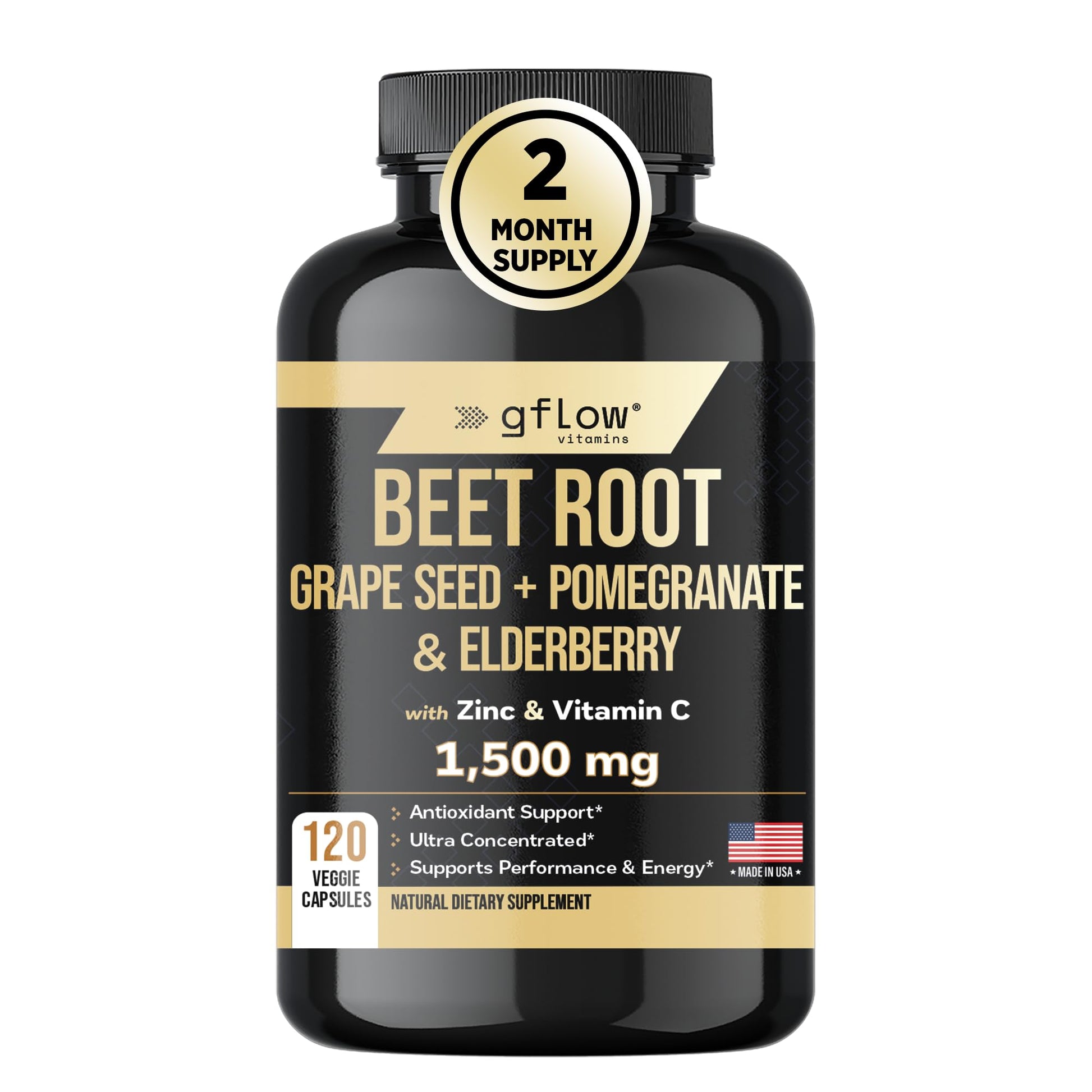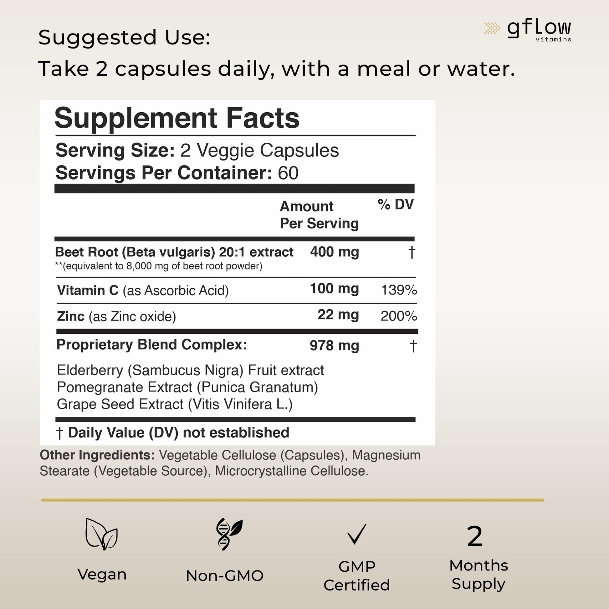 Gflow Vitamins Beet Root Capsules - High concentrated formula, Beetroot Extract, Elderberry with Vitamin C, Zinc, Pomegranate, Grape Seed, Nitric Oxide Supplement - Non-GMO, USA Made - 2 Months Supply